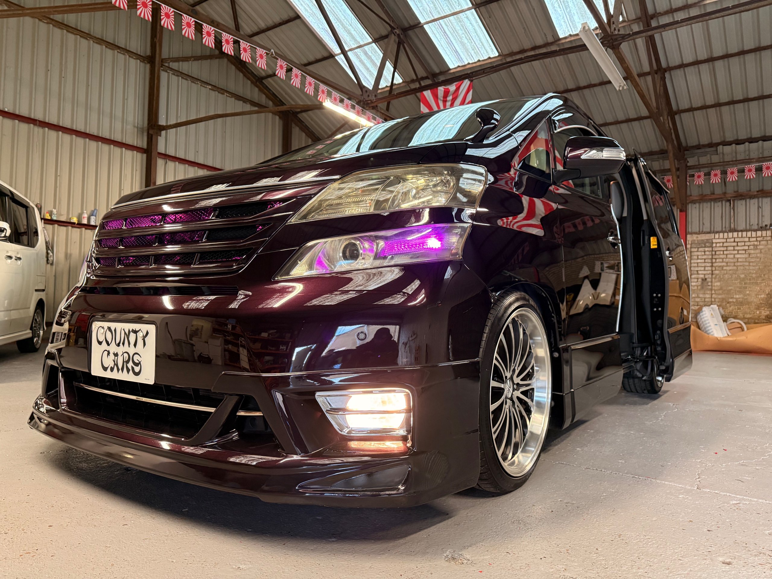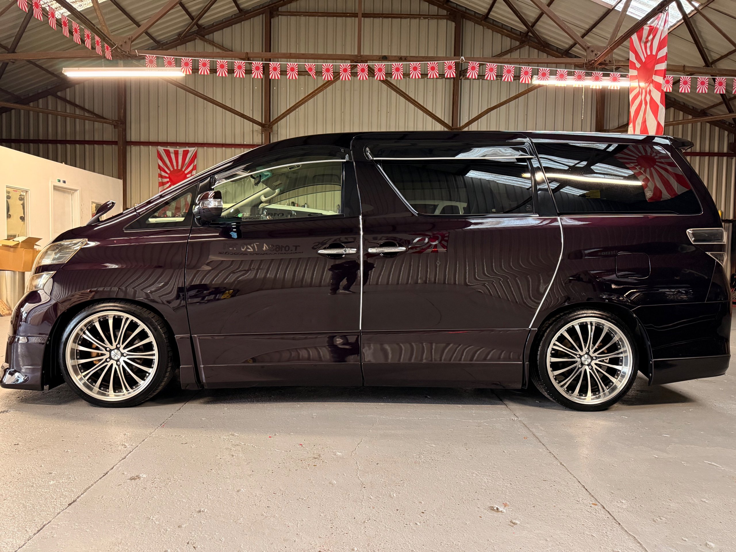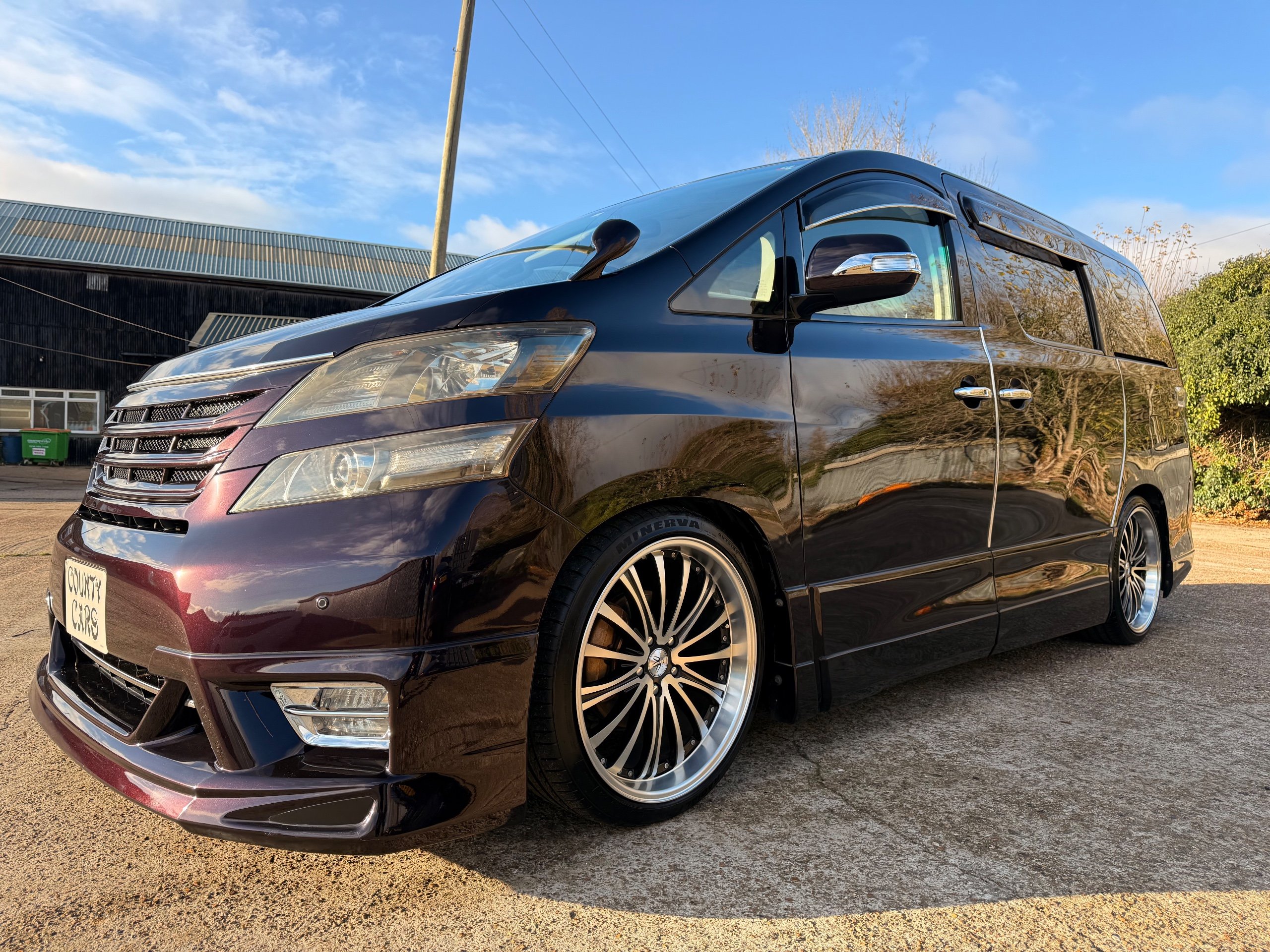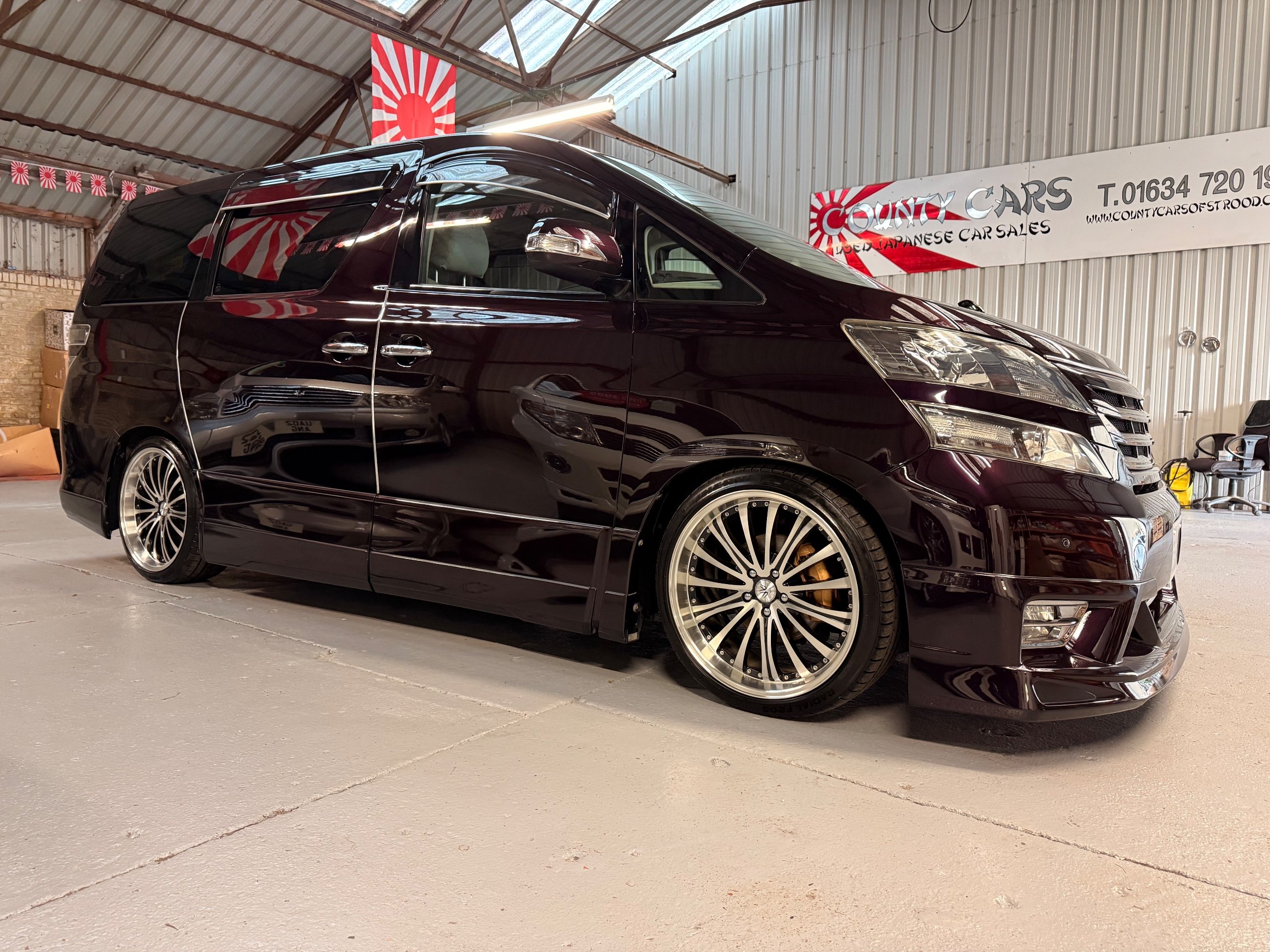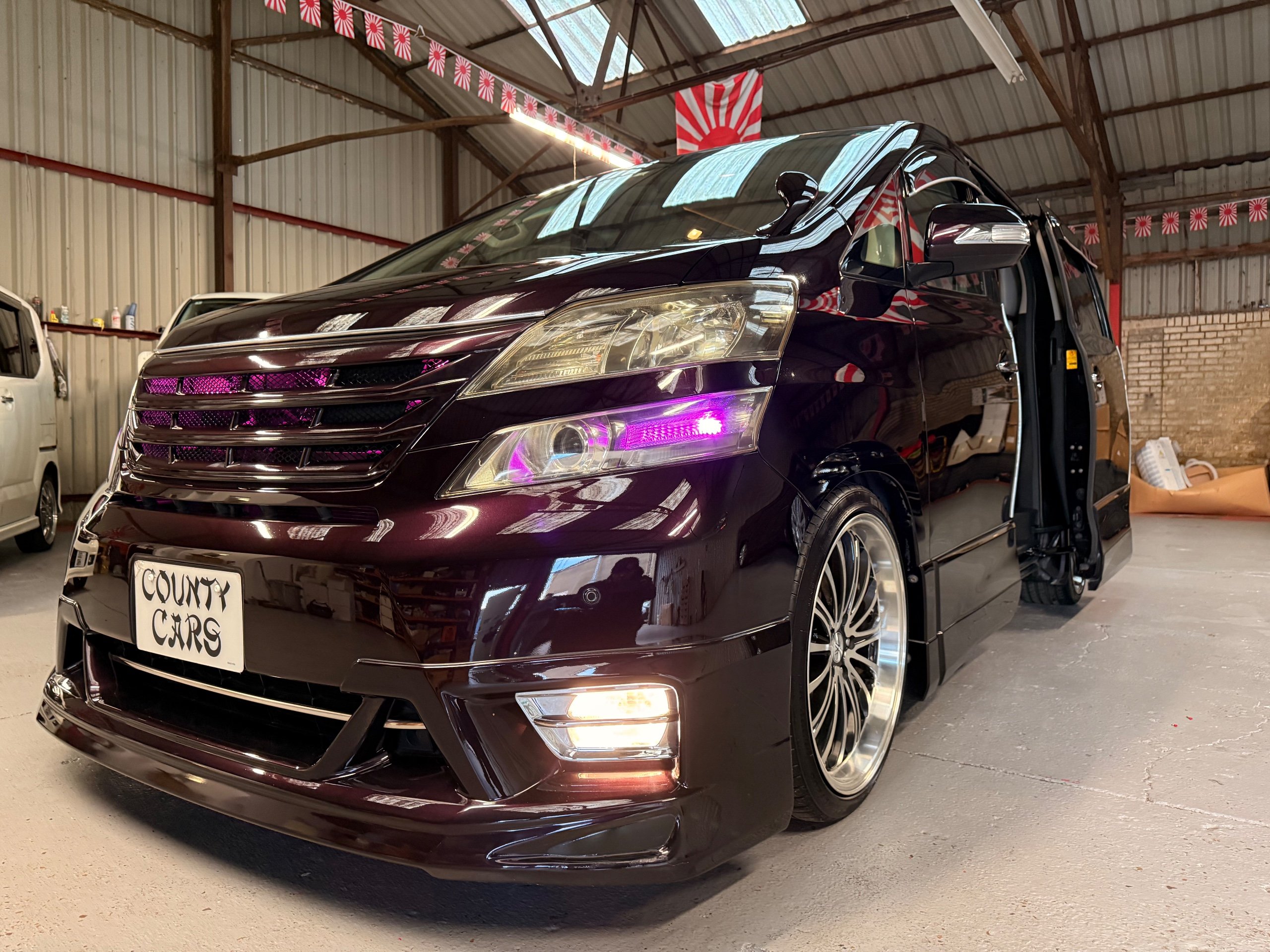 2010 Toyota Vellfire 2.4Z platinum Selection, 2010-10-Reg, Finished in Stunning Unmarked Metallic Purple paintwork, Twin Electric Soft Closing Sliding Doors, Electric Tailgate, Front spots with chrome covers, Full Privacy Glass, Rear Spoiler with built in brake light, L.E.D Lights, Chrome door handles, fold in wing mirrors with built in clear indicators with chrome covers, 20” multi spoke alloys with black gloss centres, rear chrome boot strip, Key-less Entry, Key-less start, 7 Seater 7 Unblemished Grey Leather look Expensive Seat Covers, The centre seats are Lounge style seats with extra leg rests, The seats also slide forwards and backwards and side to side with a folding centre table with built in cup holders, easy access to the rear seats, The rear seats fold away to give way to a large boot, Strip L.E.D lighting, blue foot well lights,Push button Start Front and Rear parking sensors, Traction Control, Front and Rear Electric windows, Colour reversing camera, Stereo with Apple CarPlay and Android Auto, Electric Tailgate, Isofix points, Full Dash Wood Kit, Chrome Air vent covers Only covered a Genuine 63,000 Miles With All the Genuine paperwork from Japan including the auction sheet and the Export Certificate which both prove the mileage and condition before it left Japan, Car VX Checked