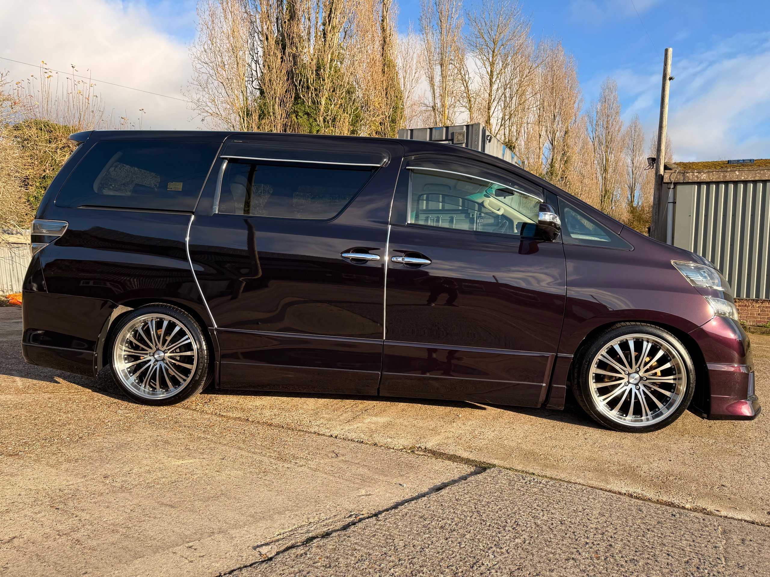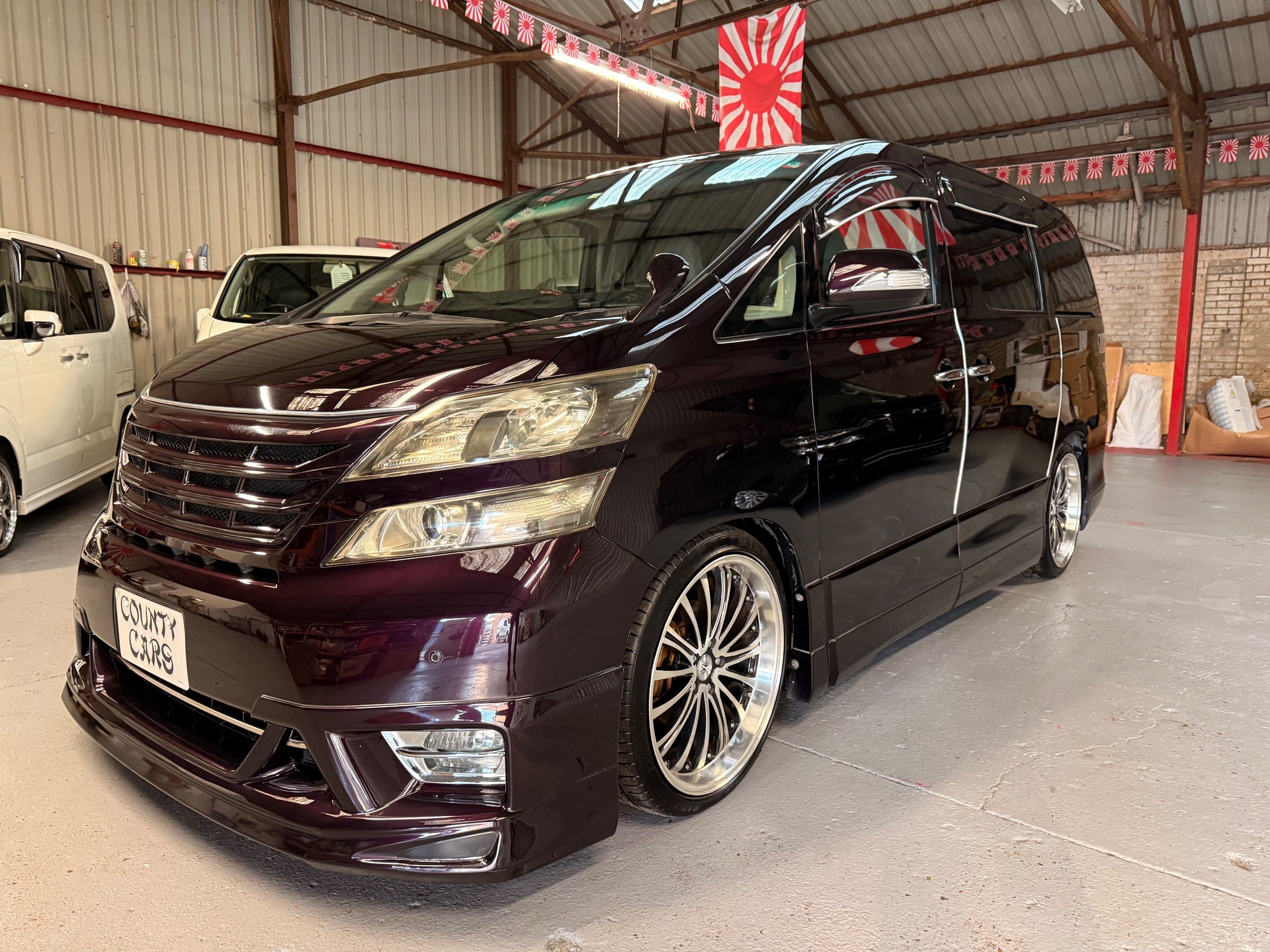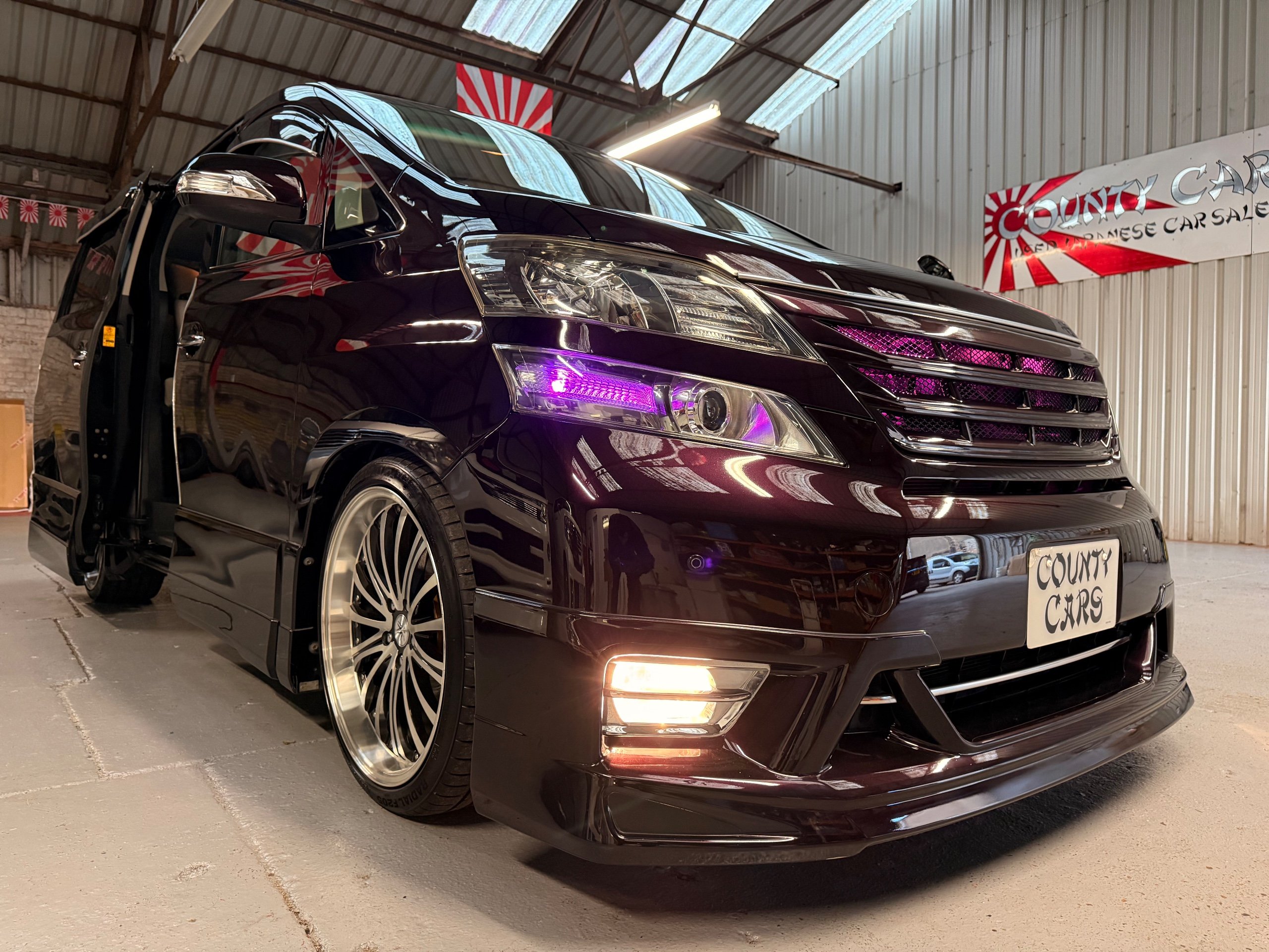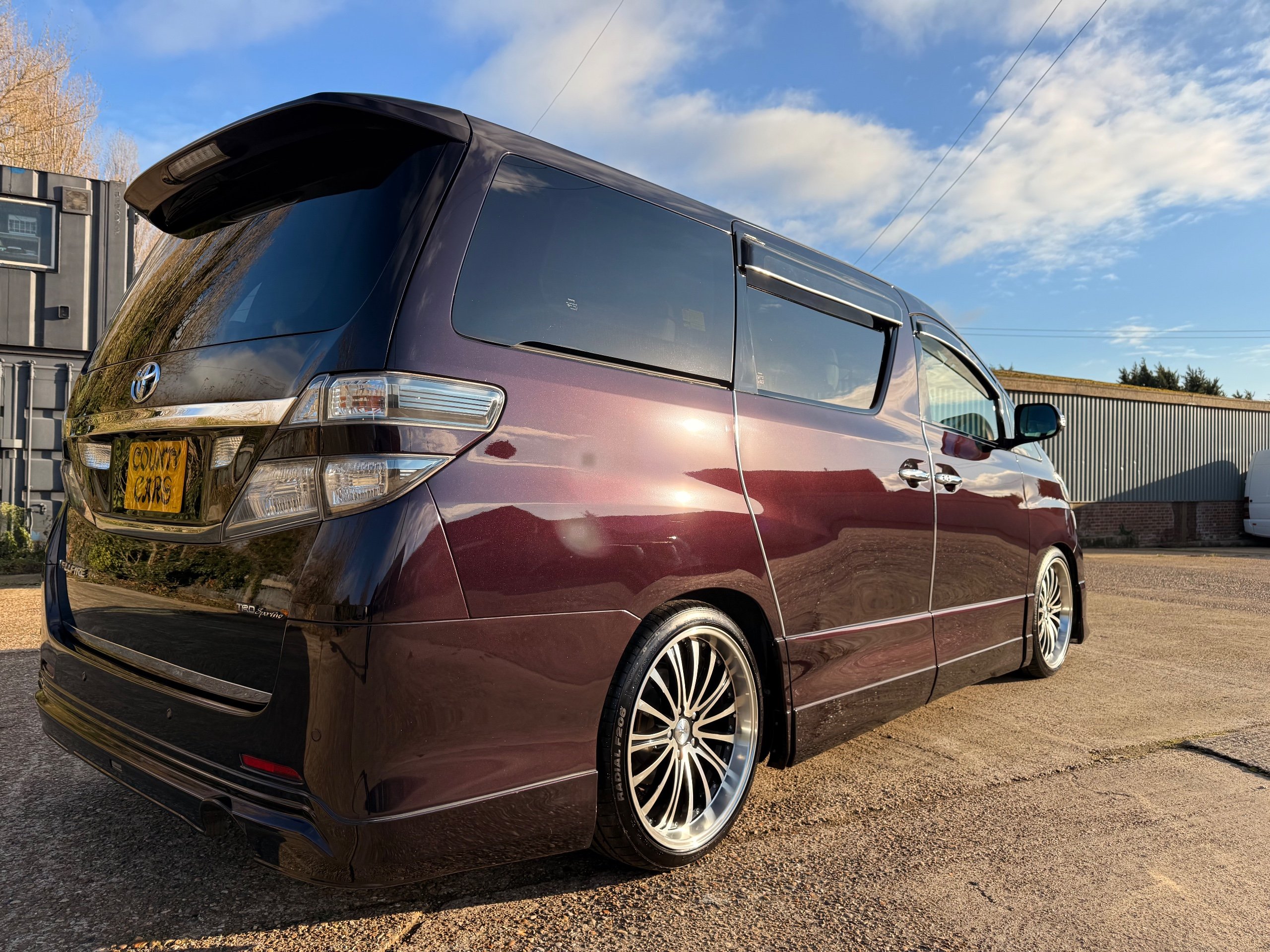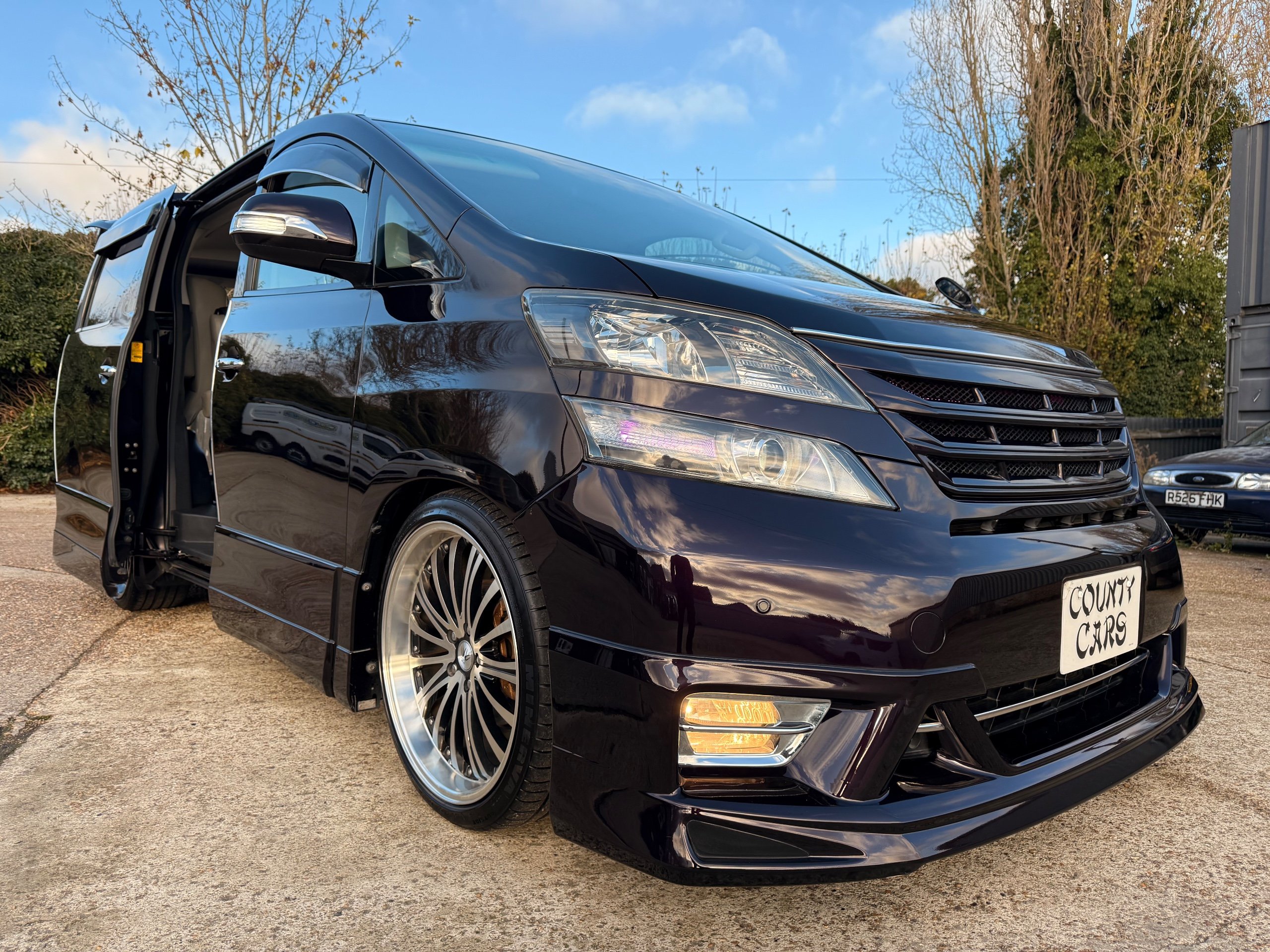 2010 Toyota Vellfire 2.4Z platinum Selection, 2010-10-Reg, Finished in Stunning Unmarked Metallic Purple paintwork, Twin Electric Soft Closing Sliding Doors, Electric Tailgate, Front spots with chrome covers, Full Privacy Glass, Rear Spoiler with built in brake light, L.E.D Lights, Chrome door handles, fold in wing mirrors with built in clear indicators with chrome covers, 20” multi spoke alloys with black gloss centres, rear chrome boot strip, Key-less Entry, Key-less start, 7 Seater 7 Unblemished Grey Leather look Expensive Seat Covers, The centre seats are Lounge style seats with extra leg rests, The seats also slide forwards and backwards and side to side with a folding centre table with built in cup holders, easy access to the rear seats, The rear seats fold away to give way to a large boot, Strip L.E.D lighting, blue foot well lights,Push button Start Front and Rear parking sensors, Traction Control, Front and Rear Electric windows, Colour reversing camera, Stereo with Apple CarPlay and Android Auto, Electric Tailgate, Isofix points, Full Dash Wood Kit, Chrome Air vent covers Only covered a Genuine 63,000 Miles With All the Genuine paperwork from Japan including the auction sheet and the Export Certificate which both prove the mileage and condition before it left Japan, Car VX Checked
