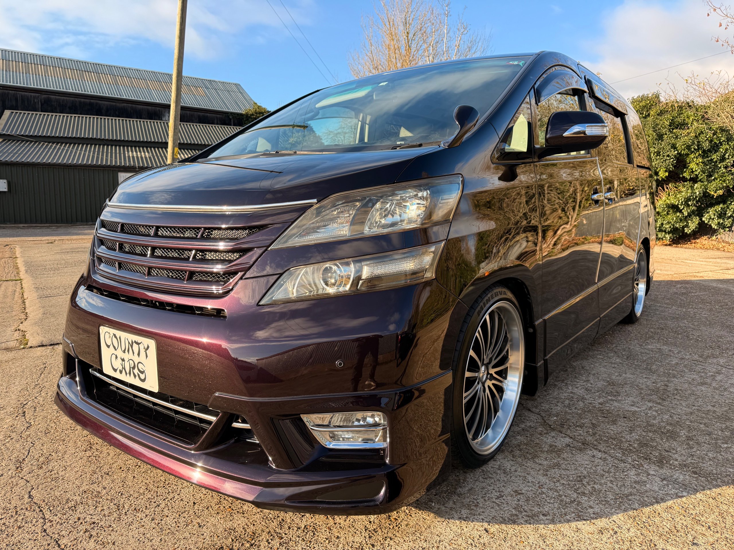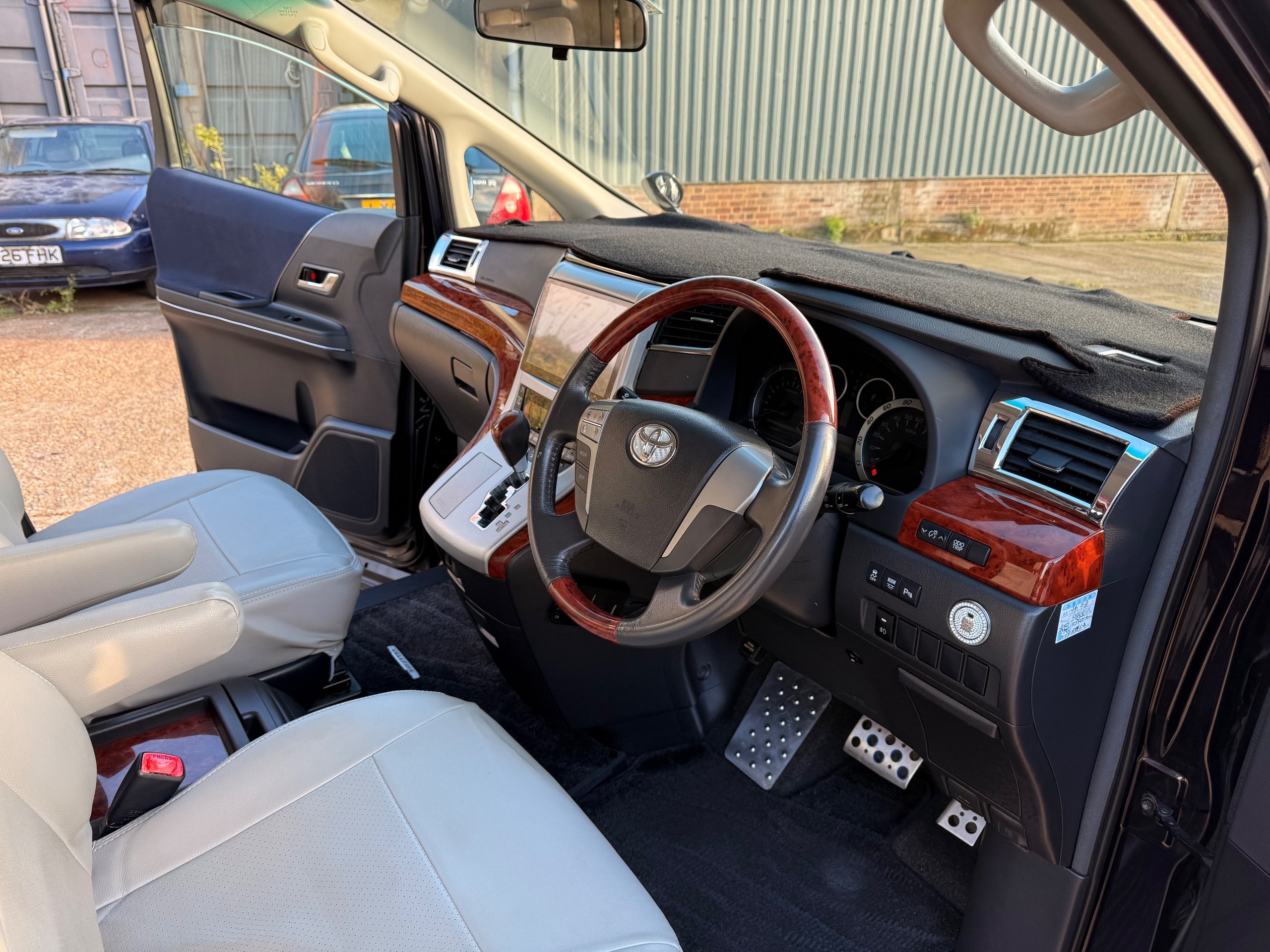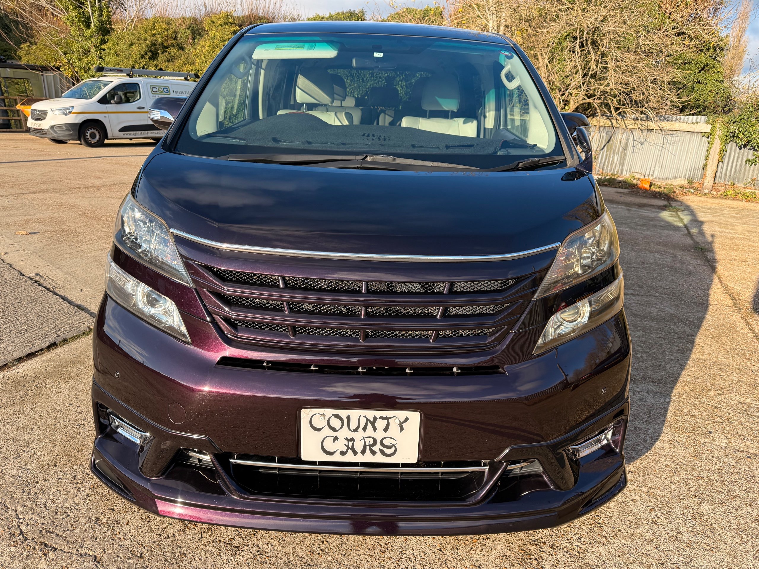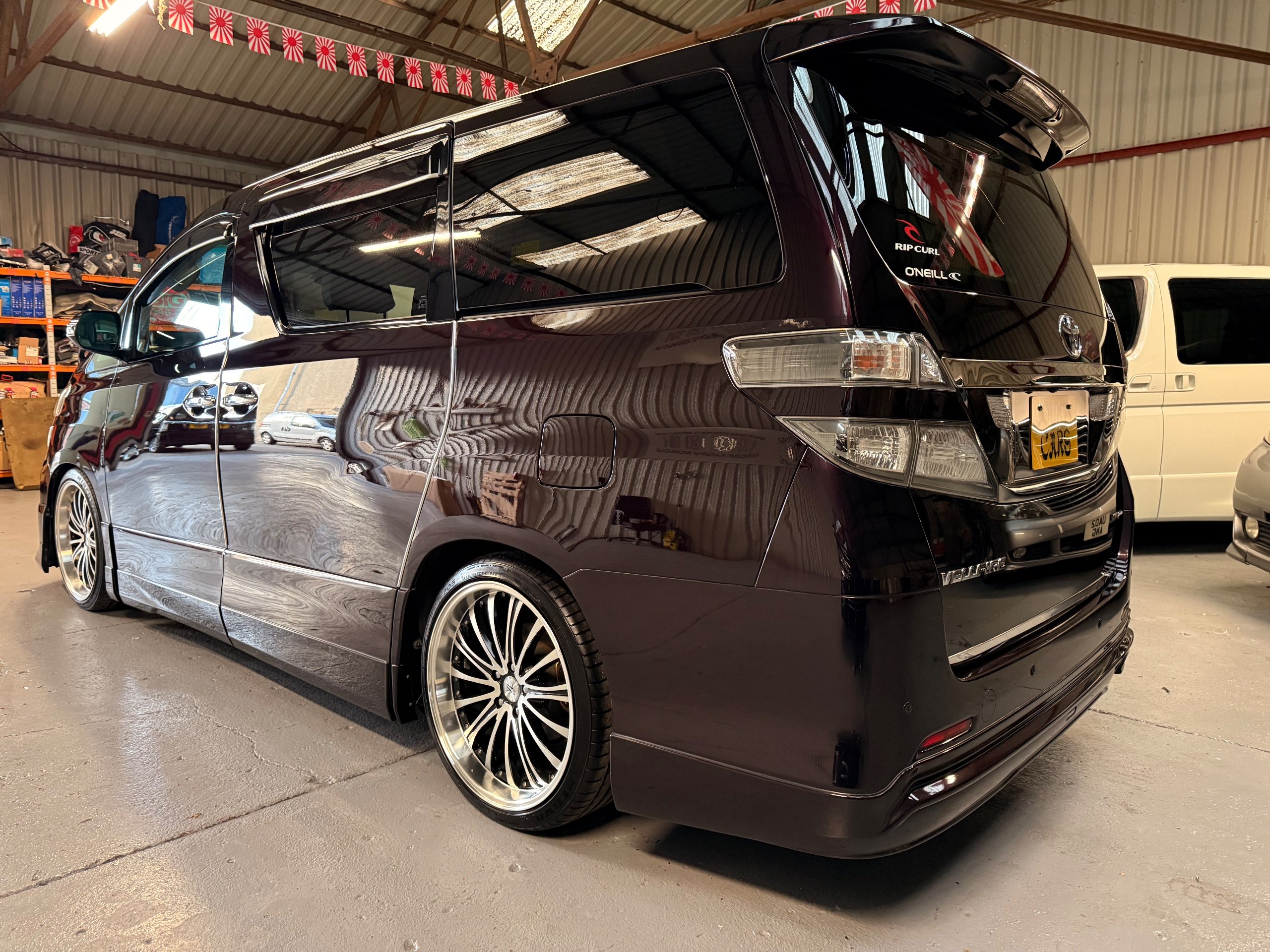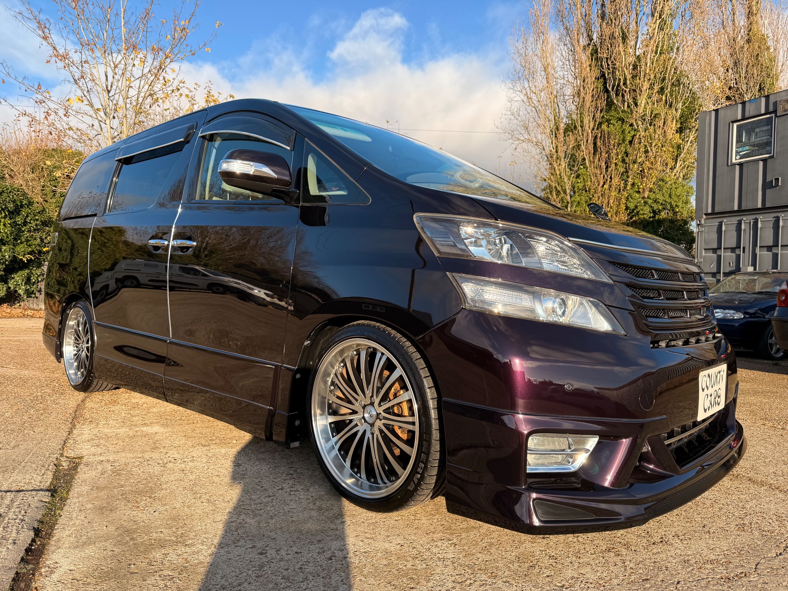 2010 Toyota Vellfire 2.4Z platinum Selection, 2010-10-Reg, Finished in Stunning Unmarked Metallic Purple paintwork, Twin Electric Soft Closing Sliding Doors, Electric Tailgate, Front spots with chrome covers, Full Privacy Glass, Rear Spoiler with built in brake light, L.E.D Lights, Chrome door handles, fold in wing mirrors with built in clear indicators with chrome covers, 20” multi spoke alloys with black gloss centres, rear chrome boot strip, Key-less Entry, Key-less start, 7 Seater 7 Unblemished Grey Leather look Expensive Seat Covers, The centre seats are Lounge style seats with extra leg rests, The seats also slide forwards and backwards and side to side with a folding centre table with built in cup holders, easy access to the rear seats, The rear seats fold away to give way to a large boot, Strip L.E.D lighting, blue foot well lights,Push button Start Front and Rear parking sensors, Traction Control, Front and Rear Electric windows, Colour reversing camera, Stereo with Apple CarPlay and Android Auto, Electric Tailgate, Isofix points, Full Dash Wood Kit, Chrome Air vent covers Only covered a Genuine 63,000 Miles With All the Genuine paperwork from Japan including the auction sheet and the Export Certificate which both prove the mileage and condition before it left Japan, Car VX Checked