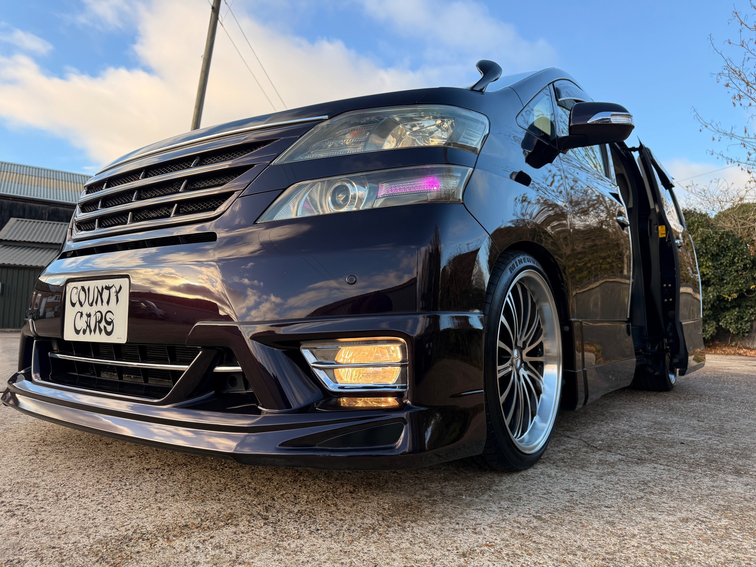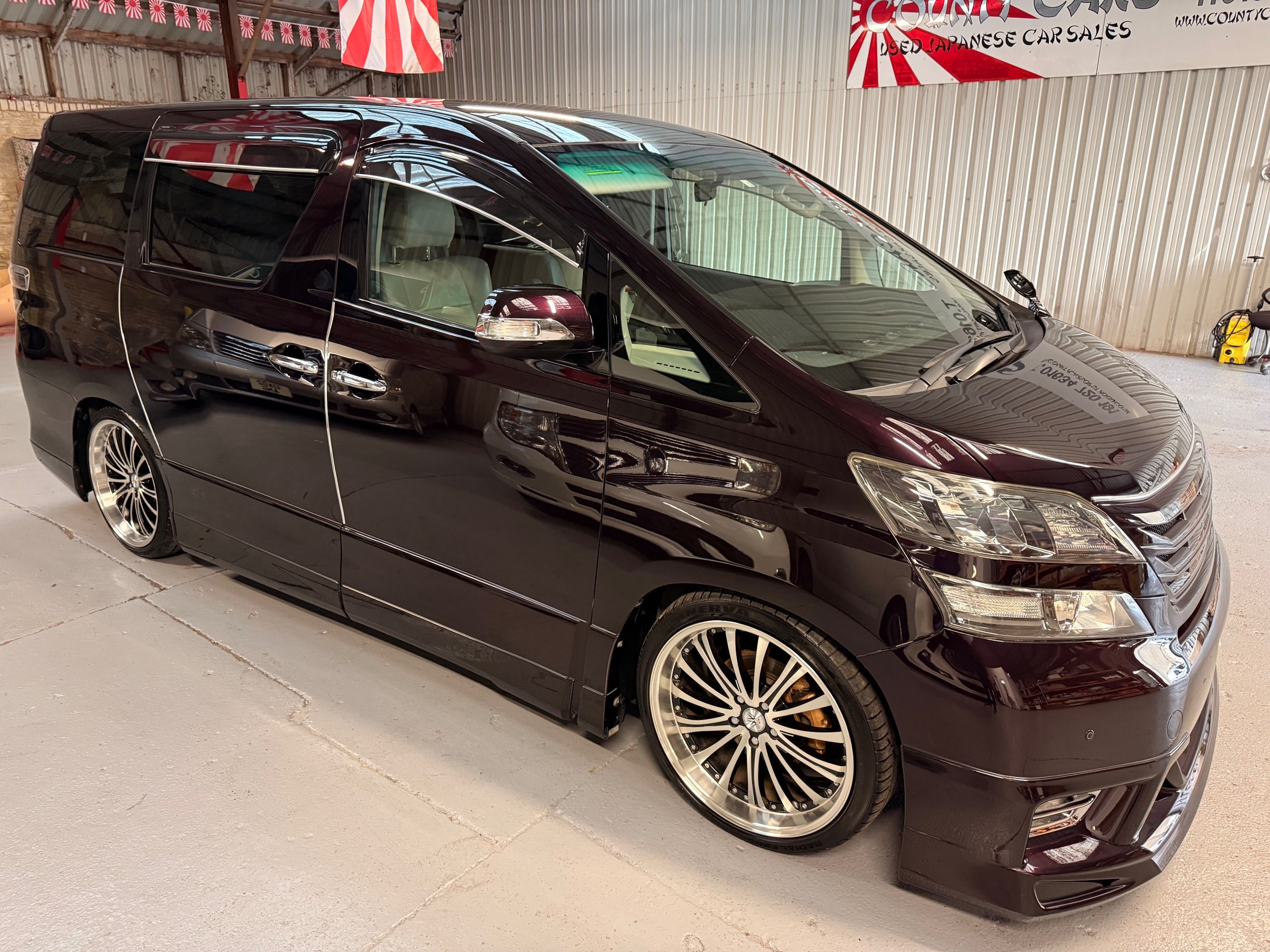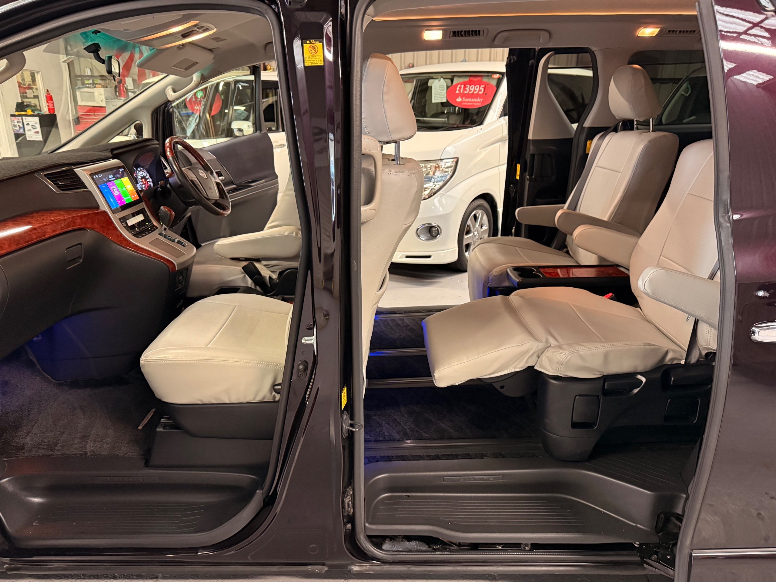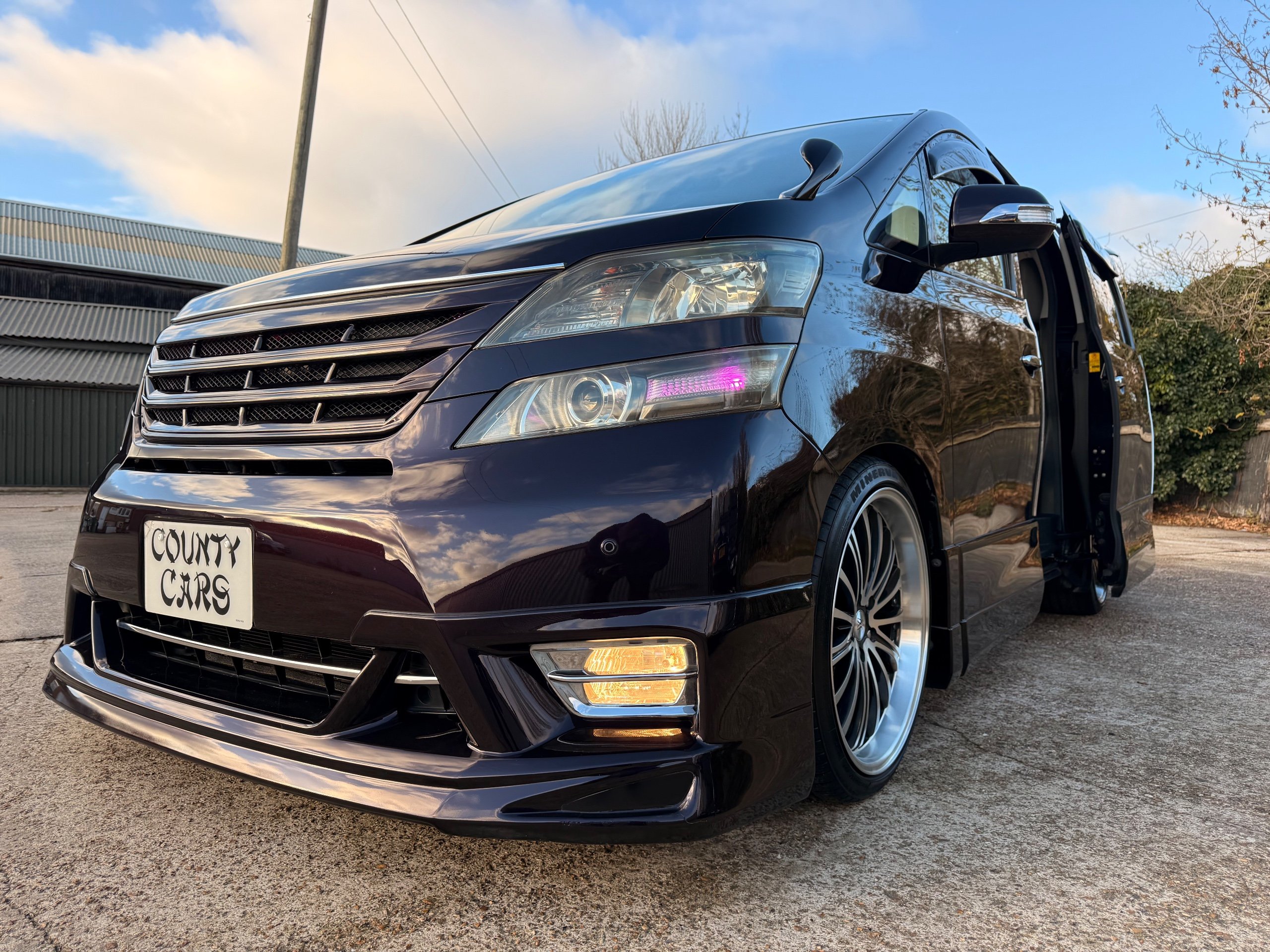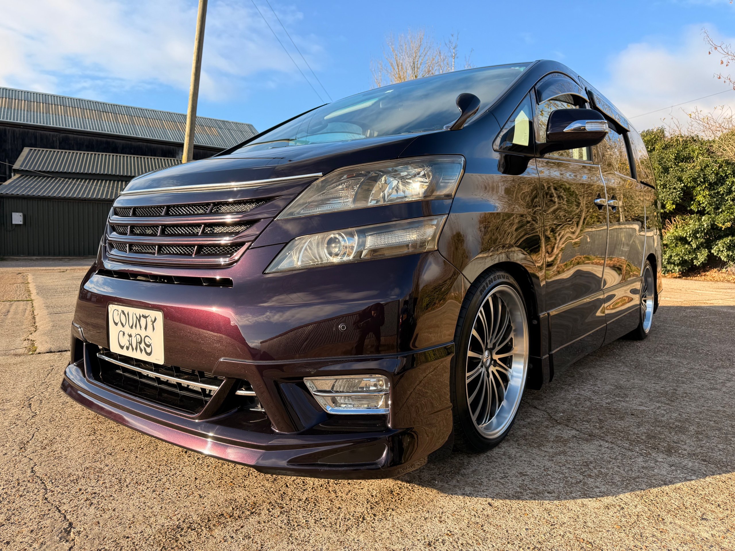 2010 Toyota Vellfire 2.4Z platinum Selection, 2010-10-Reg, Finished in Stunning Unmarked Metallic Purple paintwork, Twin Electric Soft Closing Sliding Doors, Electric Tailgate, Front spots with chrome covers, Full Privacy Glass, Rear Spoiler with built in brake light, L.E.D Lights, Chrome door handles, fold in wing mirrors with built in clear indicators with chrome covers, 20” multi spoke alloys with black gloss centres, rear chrome boot strip, Key-less Entry, Key-less start, 7 Seater 7 Unblemished Grey Leather look Expensive Seat Covers, The centre seats are Lounge style seats with extra leg rests, The seats also slide forwards and backwards and side to side with a folding centre table with built in cup holders, easy access to the rear seats, The rear seats fold away to give way to a large boot, Strip L.E.D lighting, blue foot well lights,Push button Start Front and Rear parking sensors, Traction Control, Front and Rear Electric windows, Colour reversing camera, Stereo with Apple CarPlay and Android Auto, Electric Tailgate, Isofix points, Full Dash Wood Kit, Chrome Air vent covers Only covered a Genuine 63,000 Miles With All the Genuine paperwork from Japan including the auction sheet and the Export Certificate which both prove the mileage and condition before it left Japan, Car VX Checked