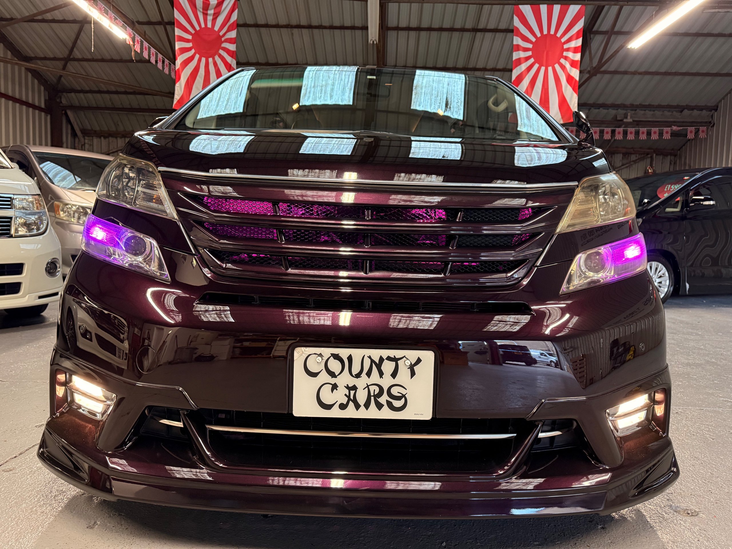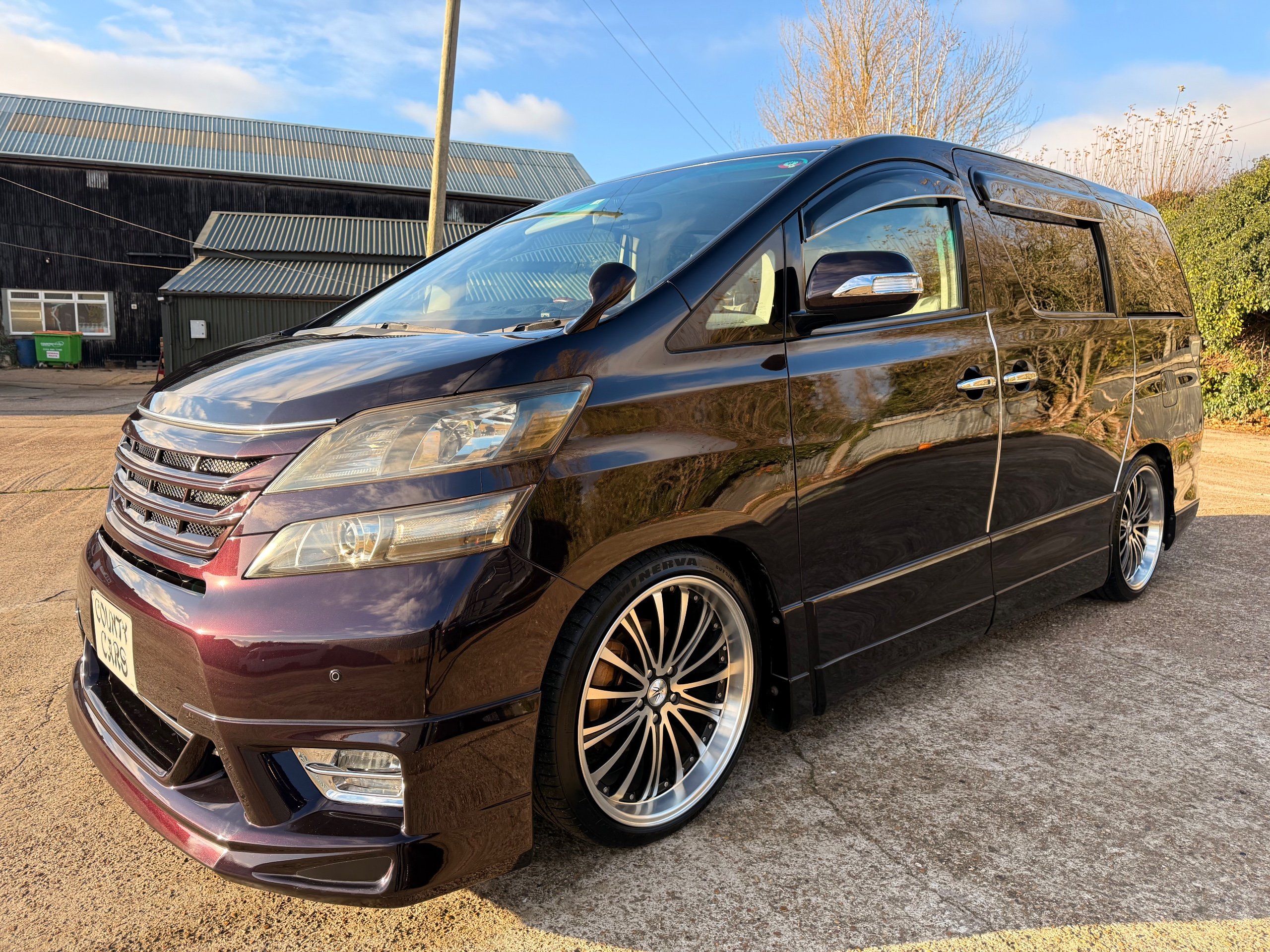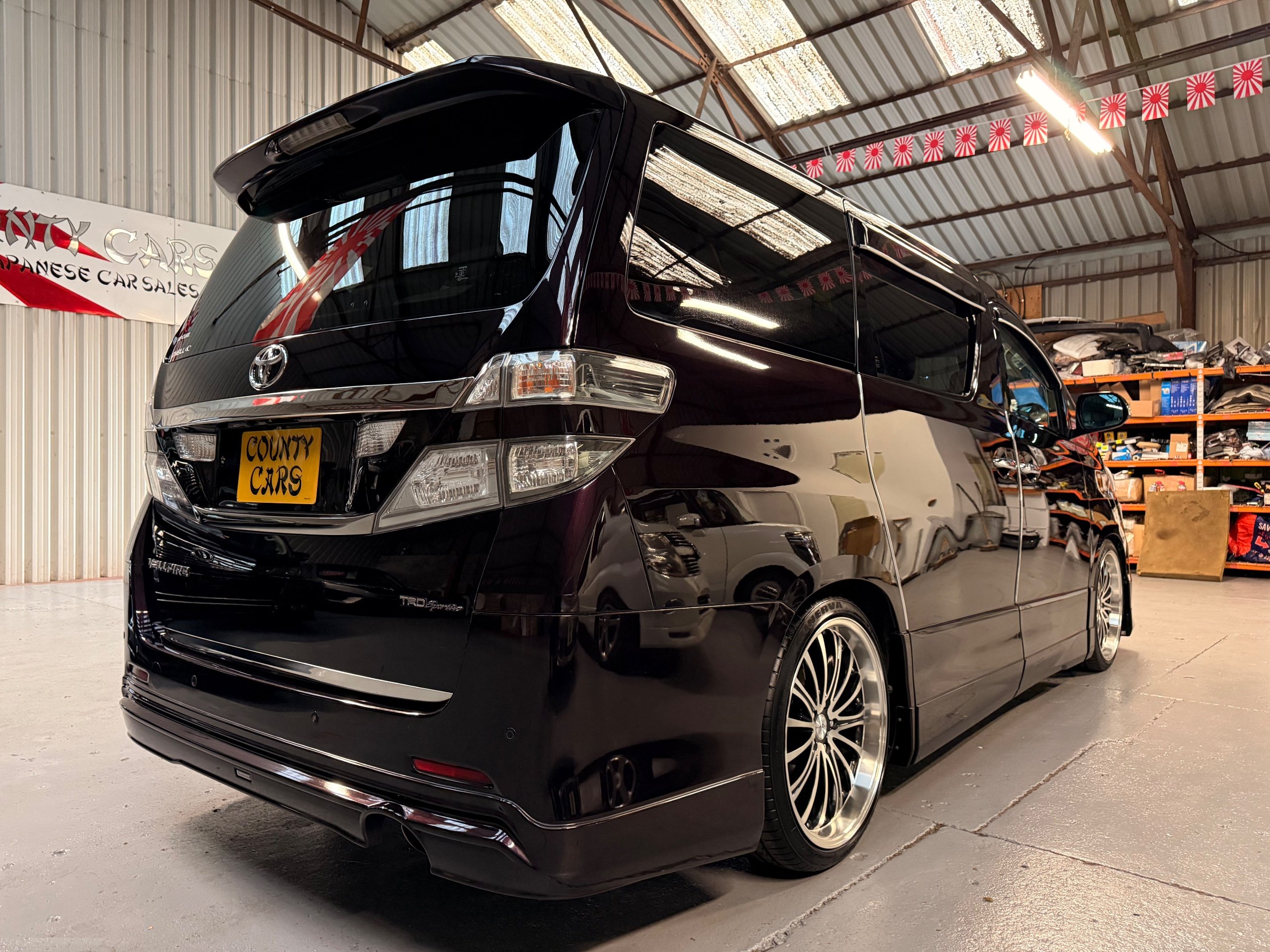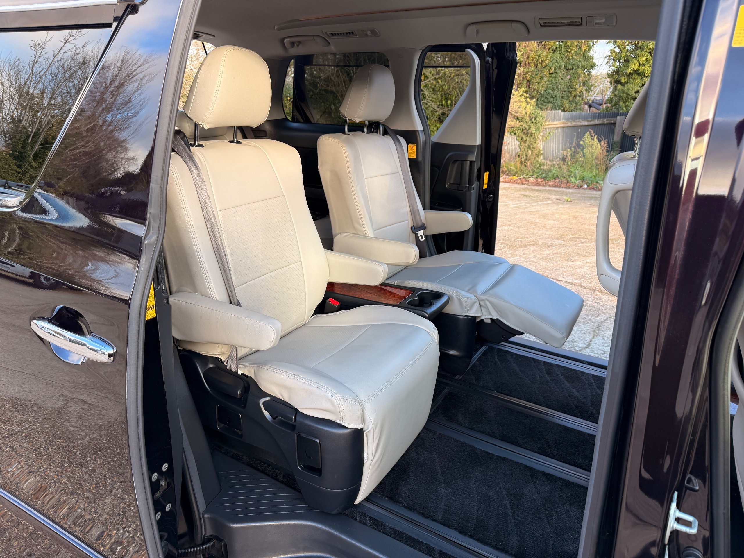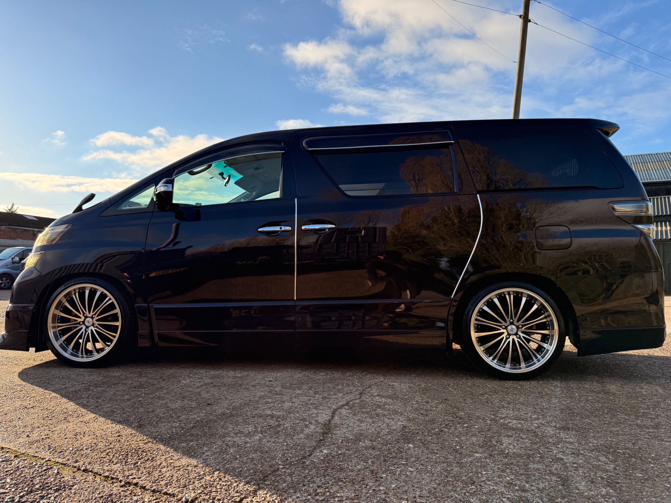 2010 Toyota Vellfire 2.4Z platinum Selection, 2010-10-Reg, Finished in Stunning Unmarked Metallic Purple paintwork, Twin Electric Soft Closing Sliding Doors, Electric Tailgate, Front spots with chrome covers, Full Privacy Glass, Rear Spoiler with built in brake light, L.E.D Lights, Chrome door handles, fold in wing mirrors with built in clear indicators with chrome covers, 20” multi spoke alloys with black gloss centres, rear chrome boot strip, Key-less Entry, Key-less start, 7 Seater 7 Unblemished Grey Leather look Expensive Seat Covers, The centre seats are Lounge style seats with extra leg rests, The seats also slide forwards and backwards and side to side with a folding centre table with built in cup holders, easy access to the rear seats, The rear seats fold away to give way to a large boot, Strip L.E.D lighting, blue foot well lights,Push button Start Front and Rear parking sensors, Traction Control, Front and Rear Electric windows, Colour reversing camera, Stereo with Apple CarPlay and Android Auto, Electric Tailgate, Isofix points, Full Dash Wood Kit, Chrome Air vent covers Only covered a Genuine 63,000 Miles With All the Genuine paperwork from Japan including the auction sheet and the Export Certificate which both prove the mileage and condition before it left Japan, Car VX Checked