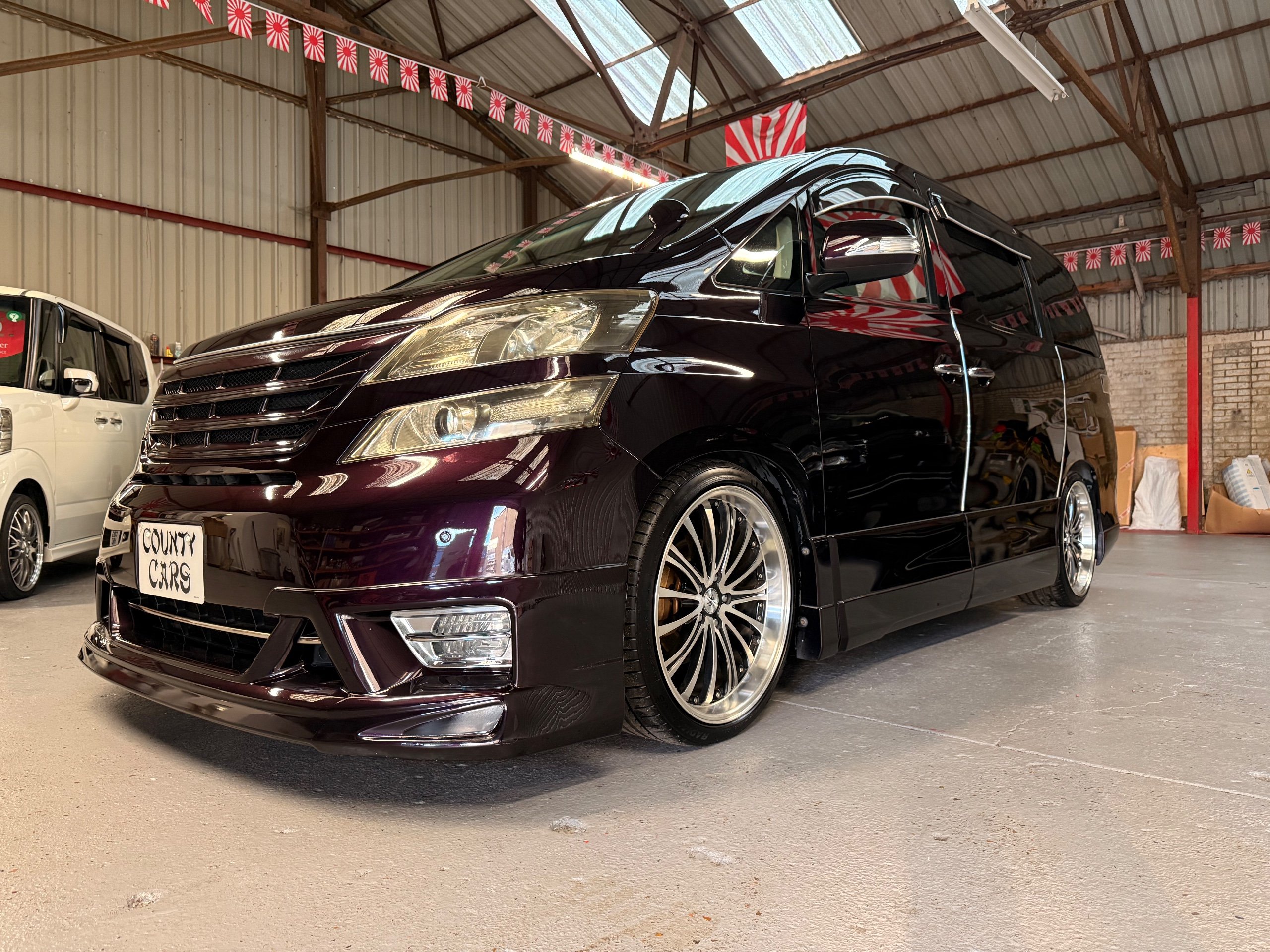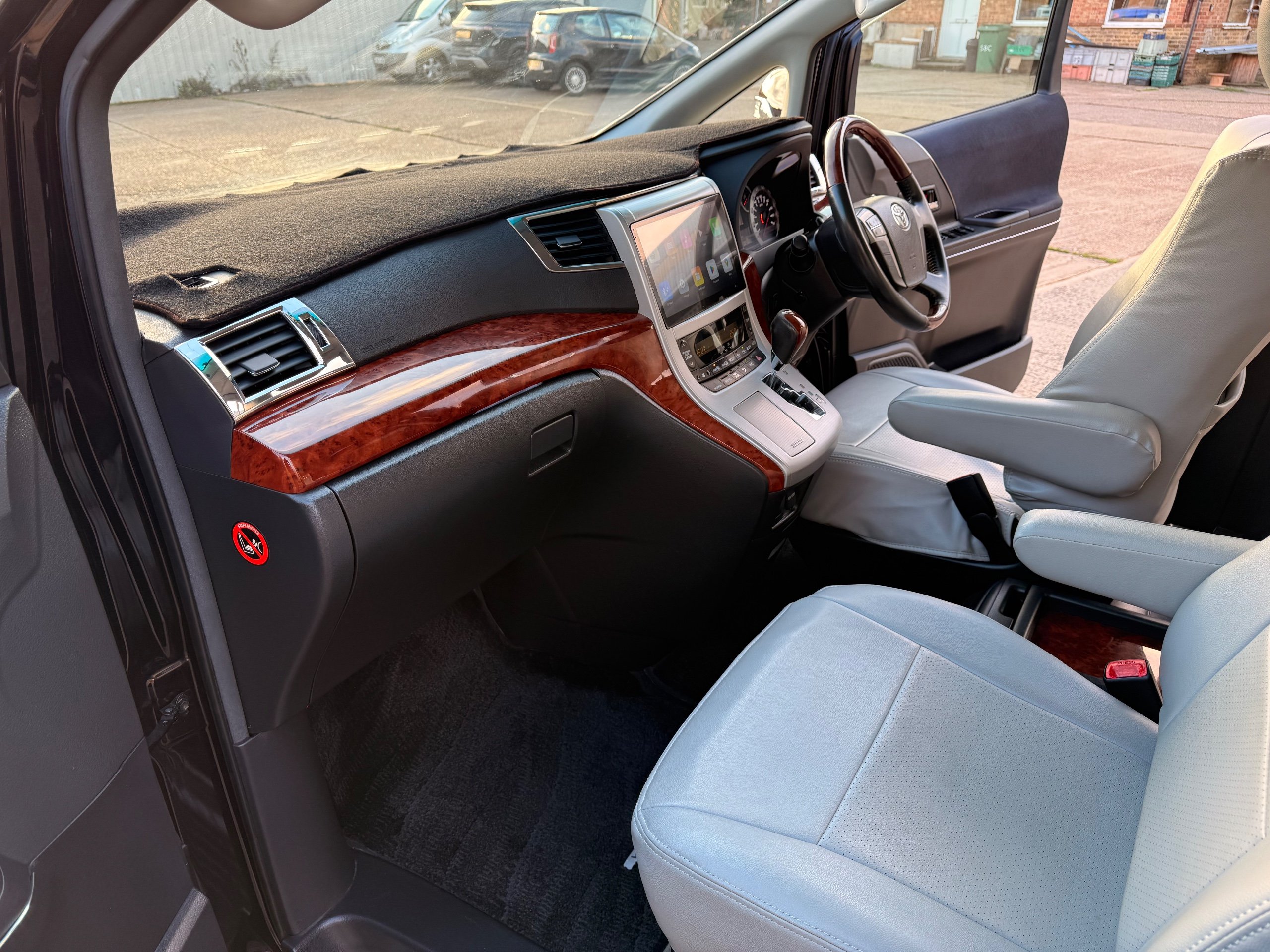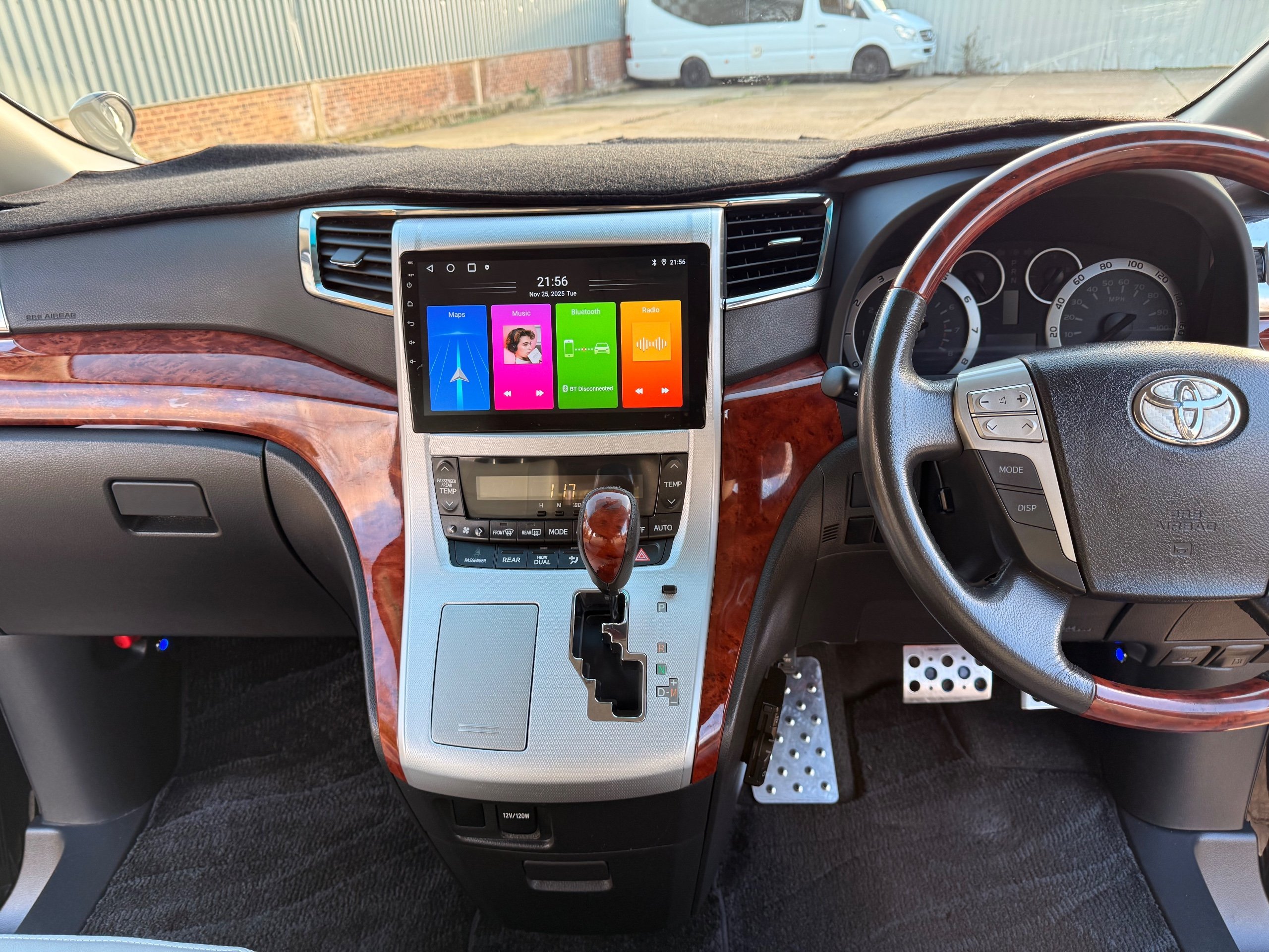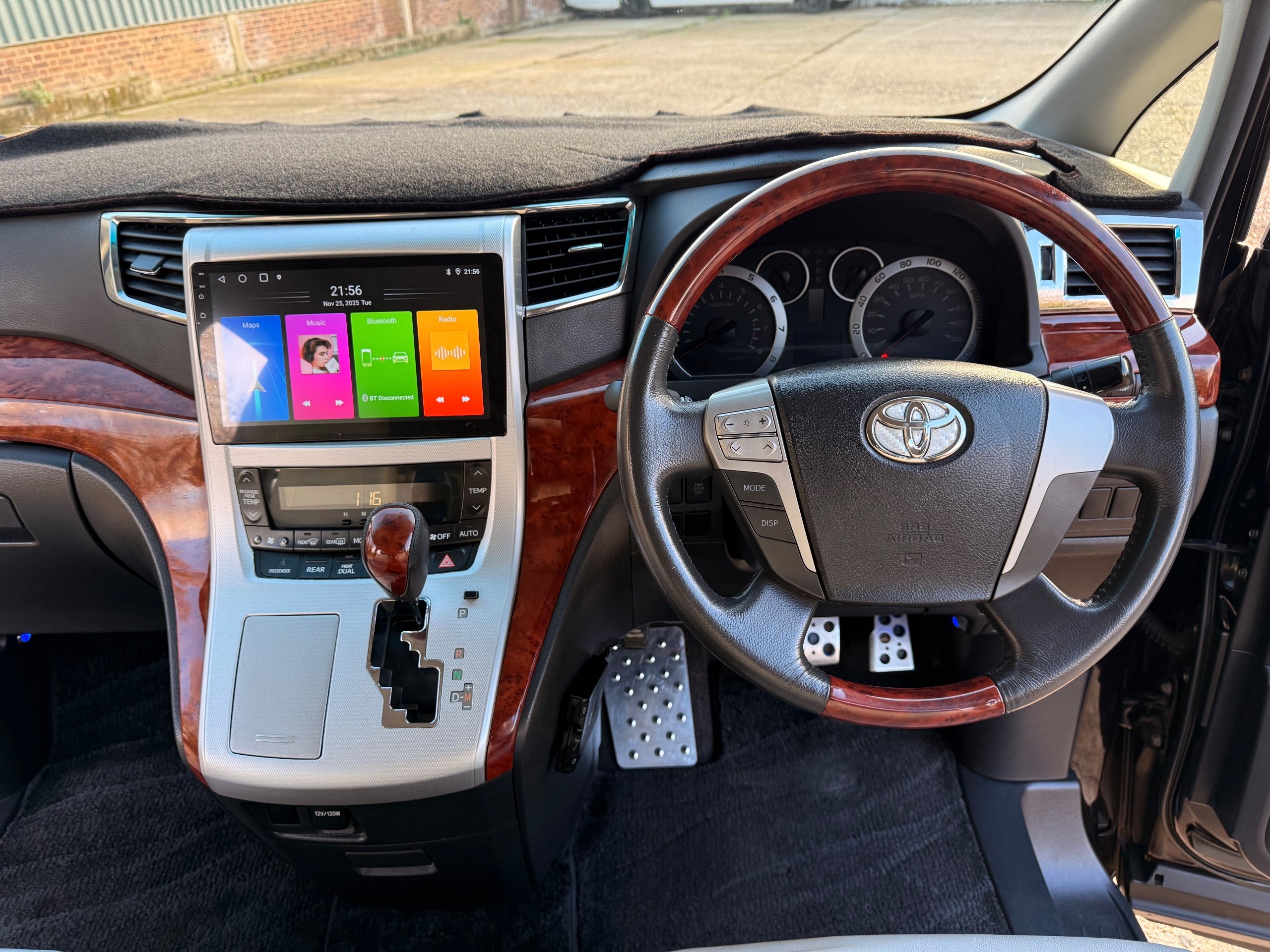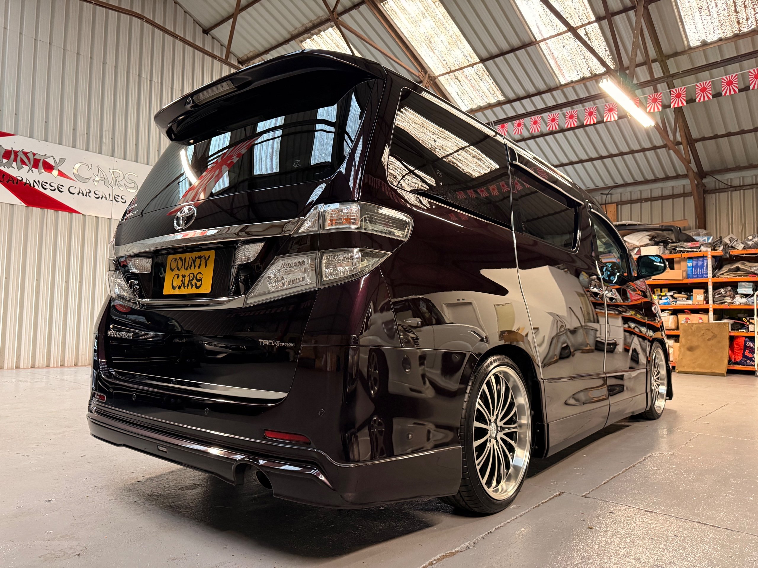 2010 Toyota Vellfire 2.4Z platinum Selection, 2010-10-Reg, Finished in Stunning Unmarked Metallic Purple paintwork, Twin Electric Soft Closing Sliding Doors, Electric Tailgate, Front spots with chrome covers, Full Privacy Glass, Rear Spoiler with built in brake light, L.E.D Lights, Chrome door handles, fold in wing mirrors with built in clear indicators with chrome covers, 20” multi spoke alloys with black gloss centres, rear chrome boot strip, Key-less Entry, Key-less start, 7 Seater 7 Unblemished Grey Leather look Expensive Seat Covers, The centre seats are Lounge style seats with extra leg rests, The seats also slide forwards and backwards and side to side with a folding centre table with built in cup holders, easy access to the rear seats, The rear seats fold away to give way to a large boot, Strip L.E.D lighting, blue foot well lights,Push button Start Front and Rear parking sensors, Traction Control, Front and Rear Electric windows, Colour reversing camera, Stereo with Apple CarPlay and Android Auto, Electric Tailgate, Isofix points, Full Dash Wood Kit, Chrome Air vent covers Only covered a Genuine 63,000 Miles With All the Genuine paperwork from Japan including the auction sheet and the Export Certificate which both prove the mileage and condition before it left Japan, Car VX Checked