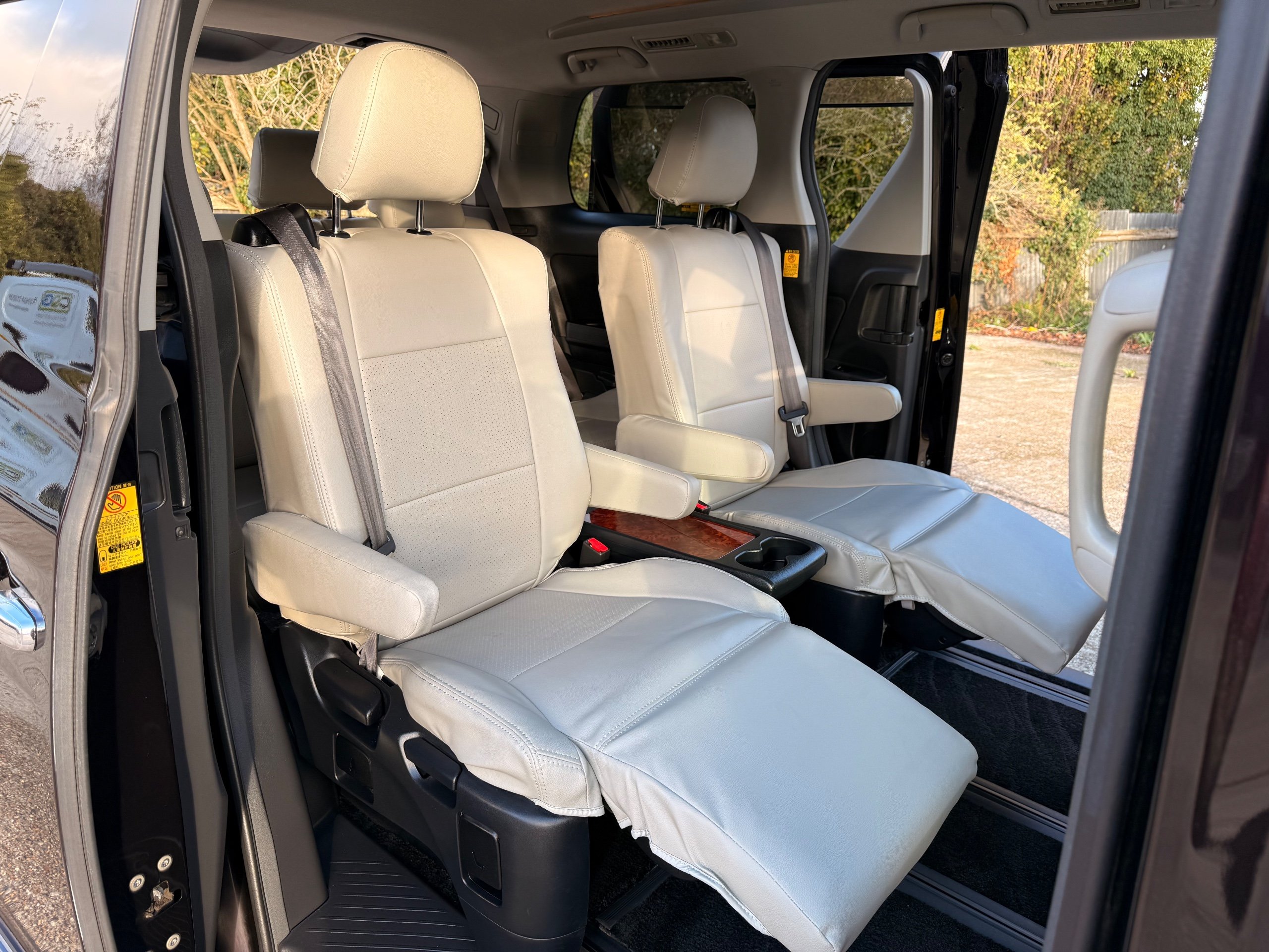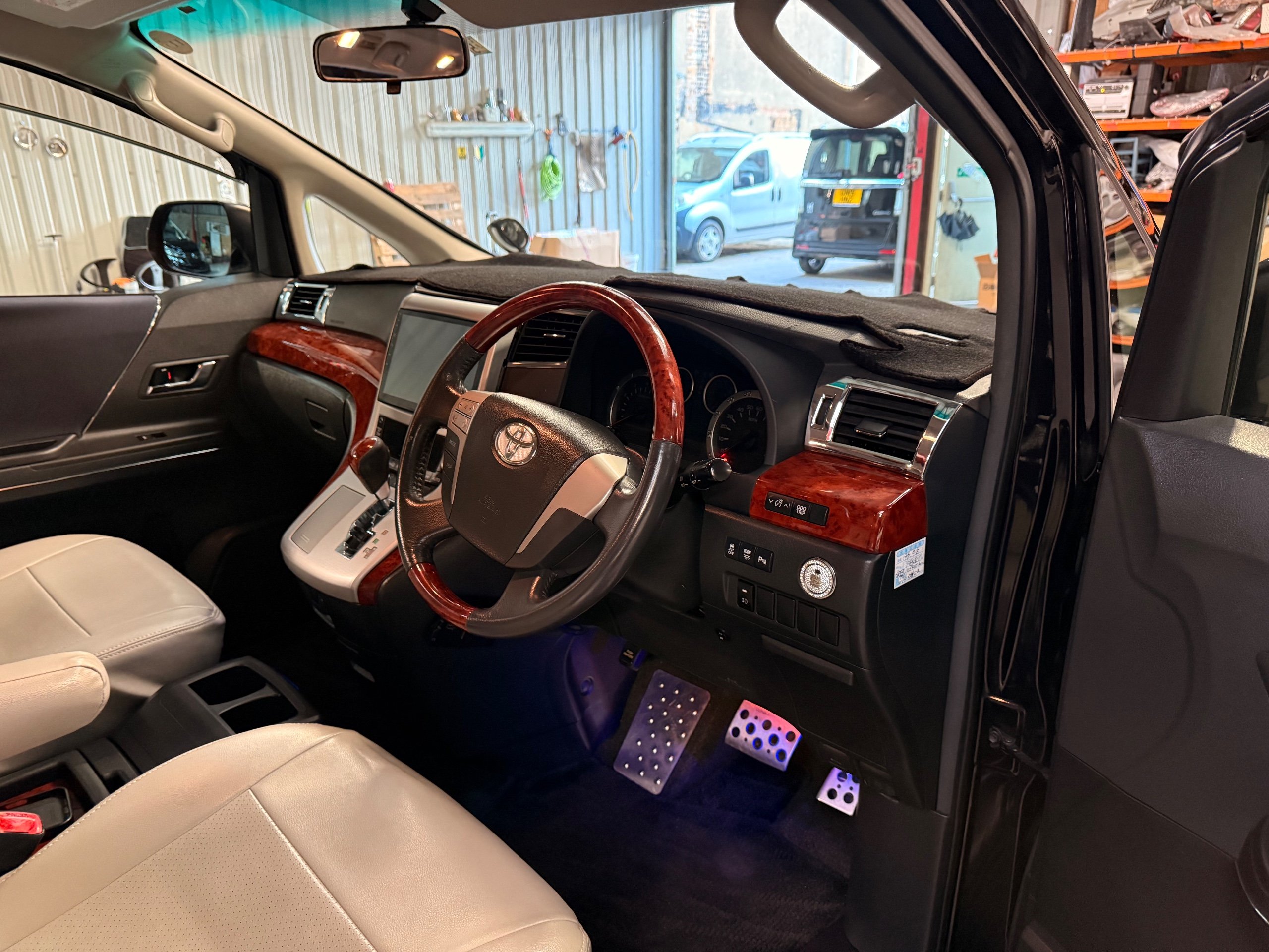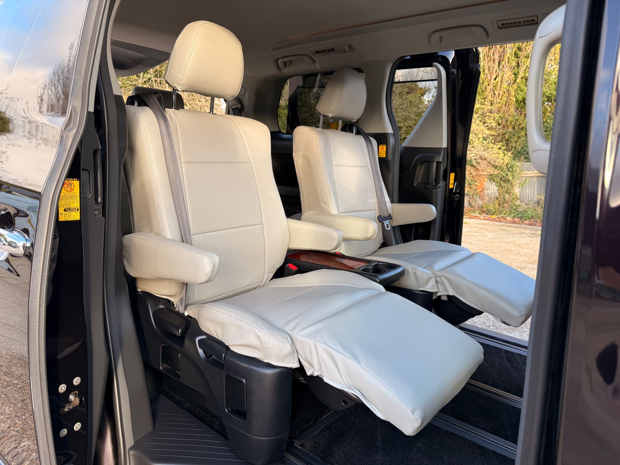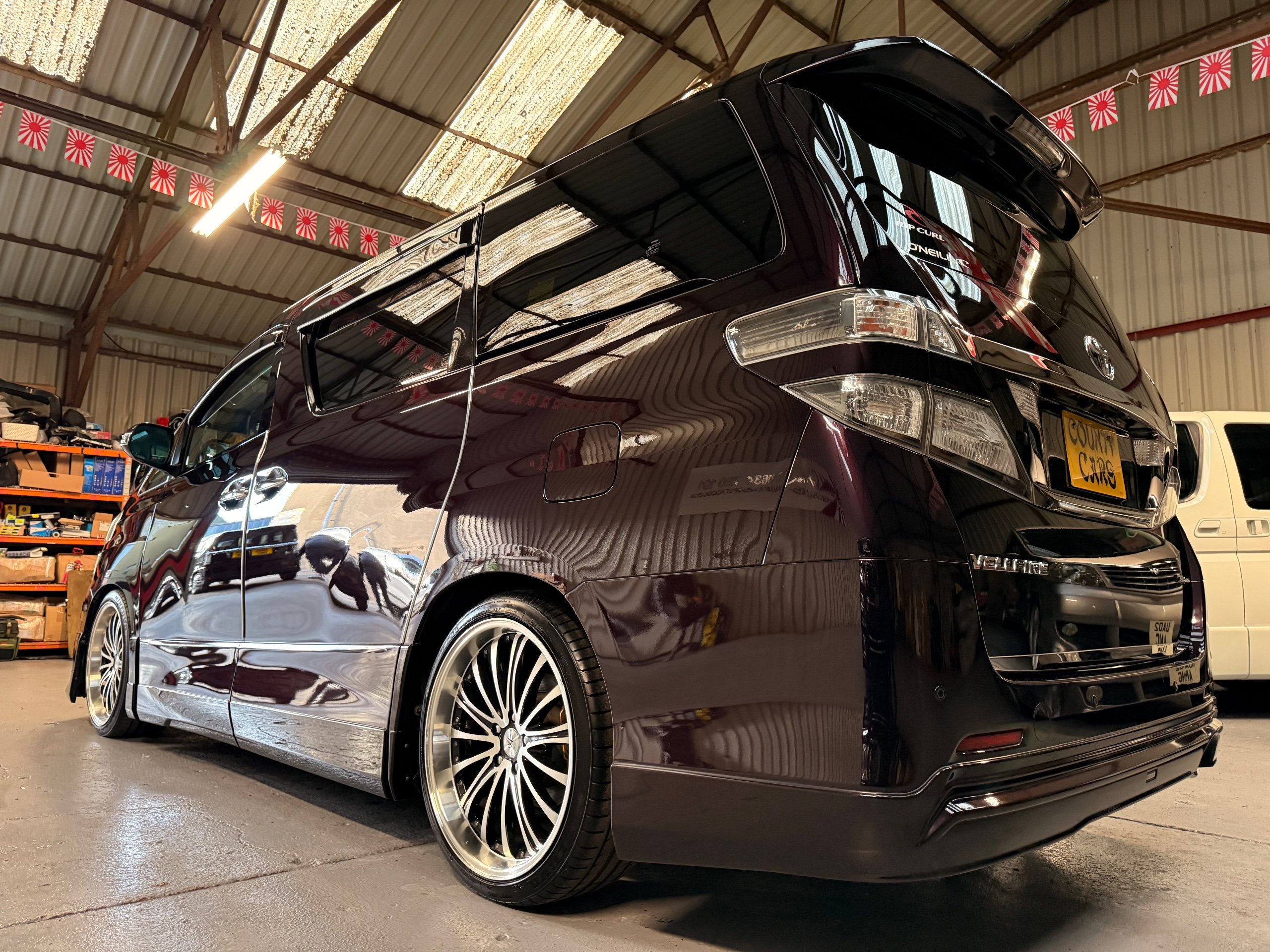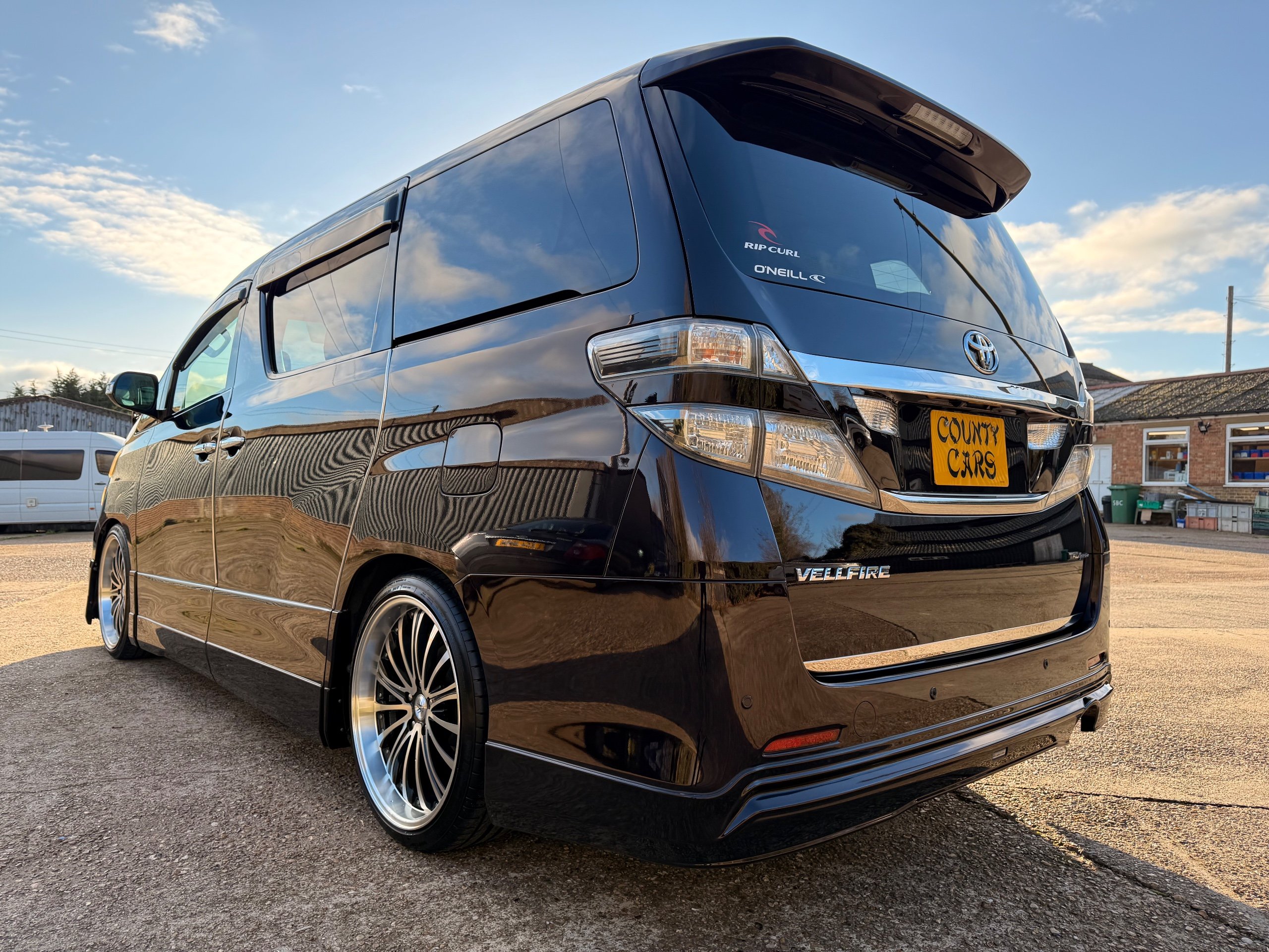 2010 Toyota Vellfire 2.4Z platinum Selection, 2010-10-Reg, Finished in Stunning Unmarked Metallic Purple paintwork, Twin Electric Soft Closing Sliding Doors, Electric Tailgate, Front spots with chrome covers, Full Privacy Glass, Rear Spoiler with built in brake light, L.E.D Lights, Chrome door handles, fold in wing mirrors with built in clear indicators with chrome covers, 20” multi spoke alloys with black gloss centres, rear chrome boot strip, Key-less Entry, Key-less start, 7 Seater 7 Unblemished Grey Leather look Expensive Seat Covers, The centre seats are Lounge style seats with extra leg rests, The seats also slide forwards and backwards and side to side with a folding centre table with built in cup holders, easy access to the rear seats, The rear seats fold away to give way to a large boot, Strip L.E.D lighting, blue foot well lights,Push button Start Front and Rear parking sensors, Traction Control, Front and Rear Electric windows, Colour reversing camera, Stereo with Apple CarPlay and Android Auto, Electric Tailgate, Isofix points, Full Dash Wood Kit, Chrome Air vent covers Only covered a Genuine 63,000 Miles With All the Genuine paperwork from Japan including the auction sheet and the Export Certificate which both prove the mileage and condition before it left Japan, Car VX Checked