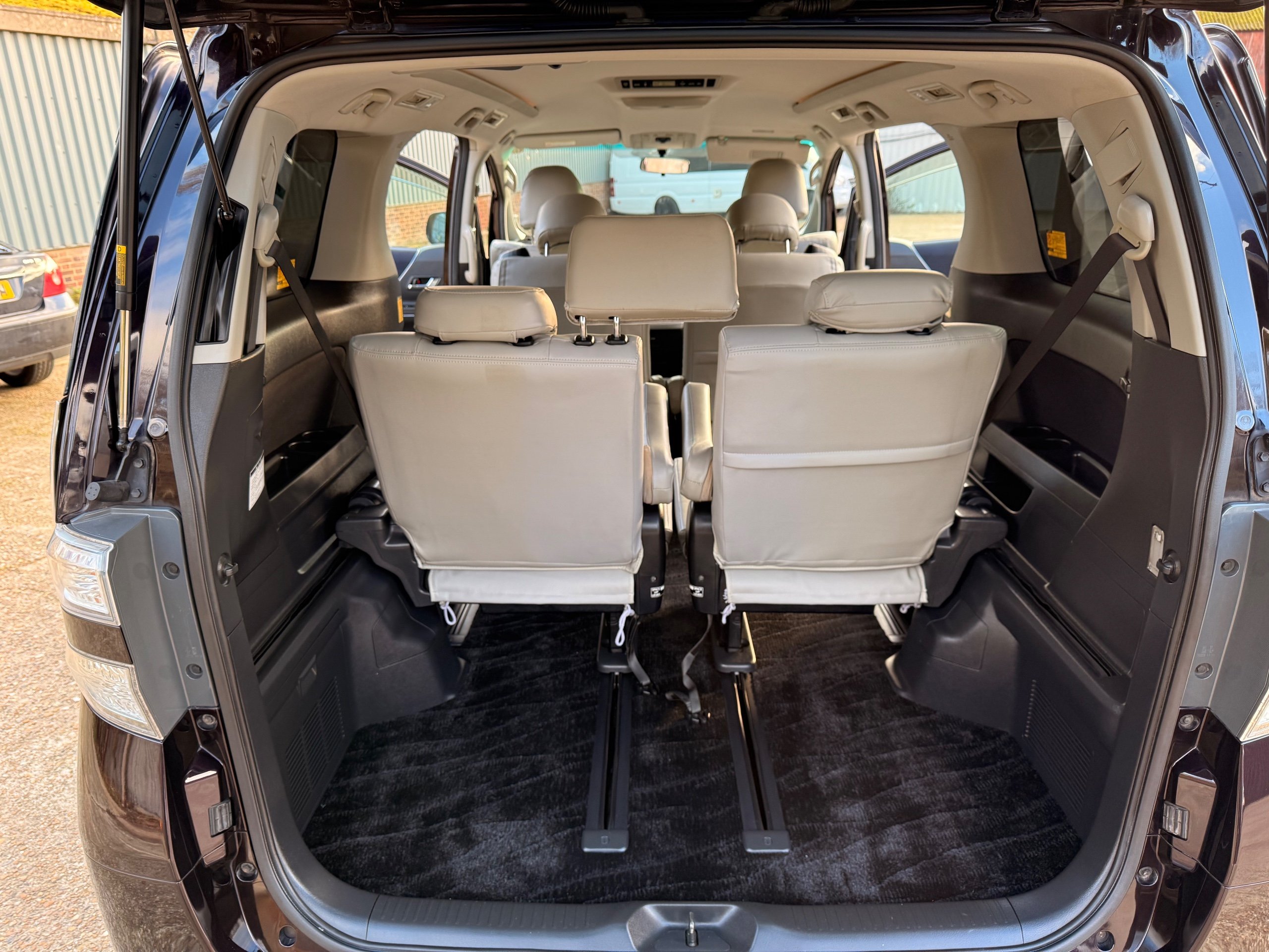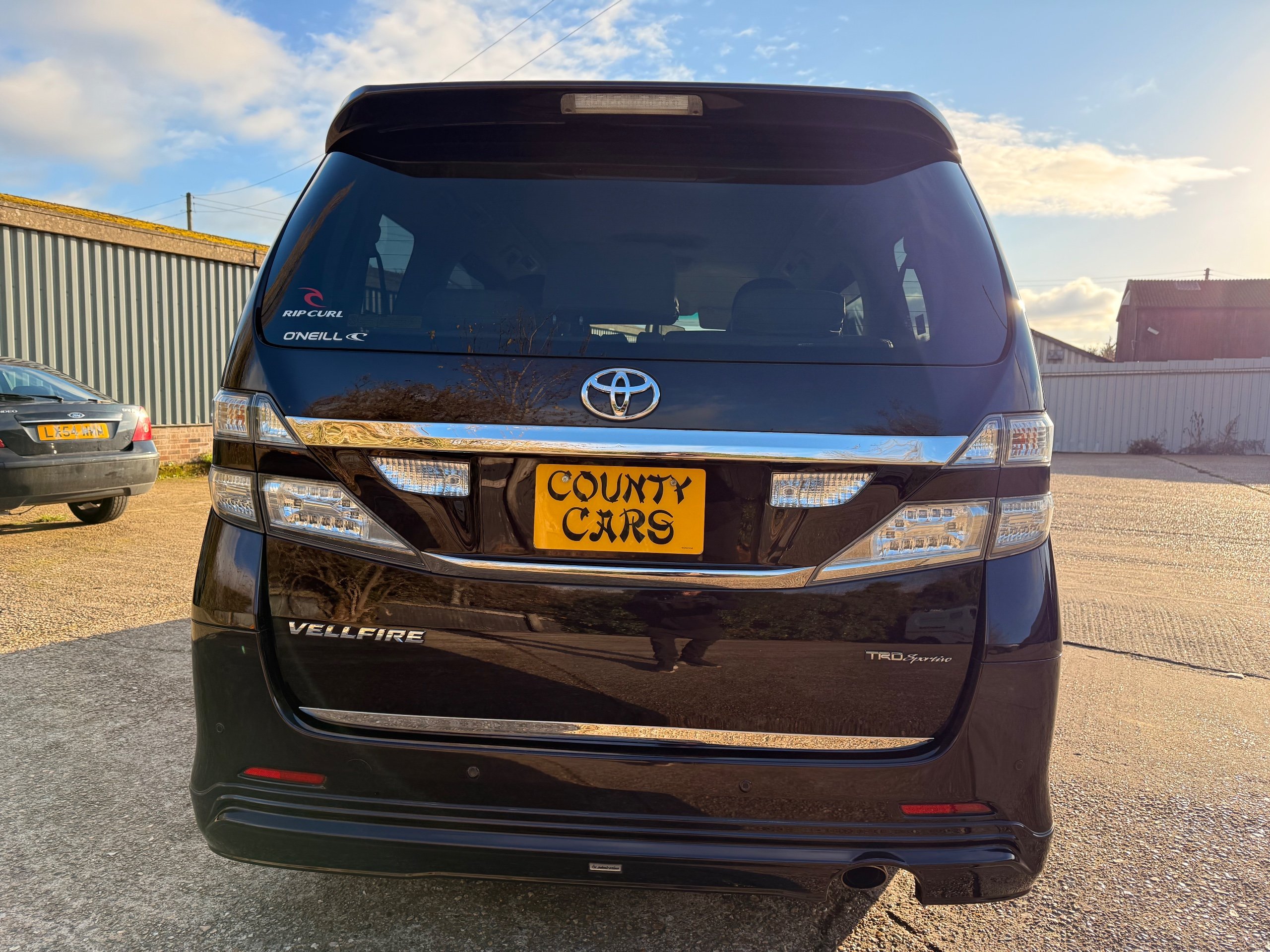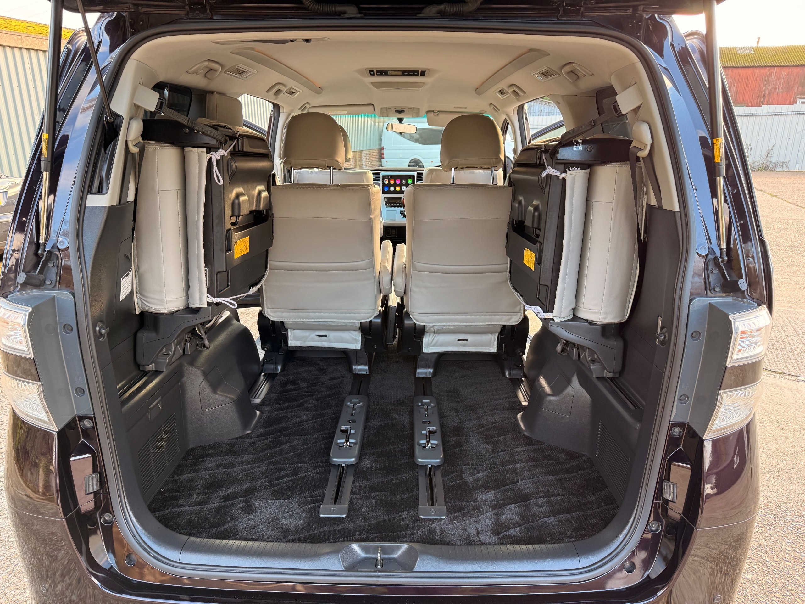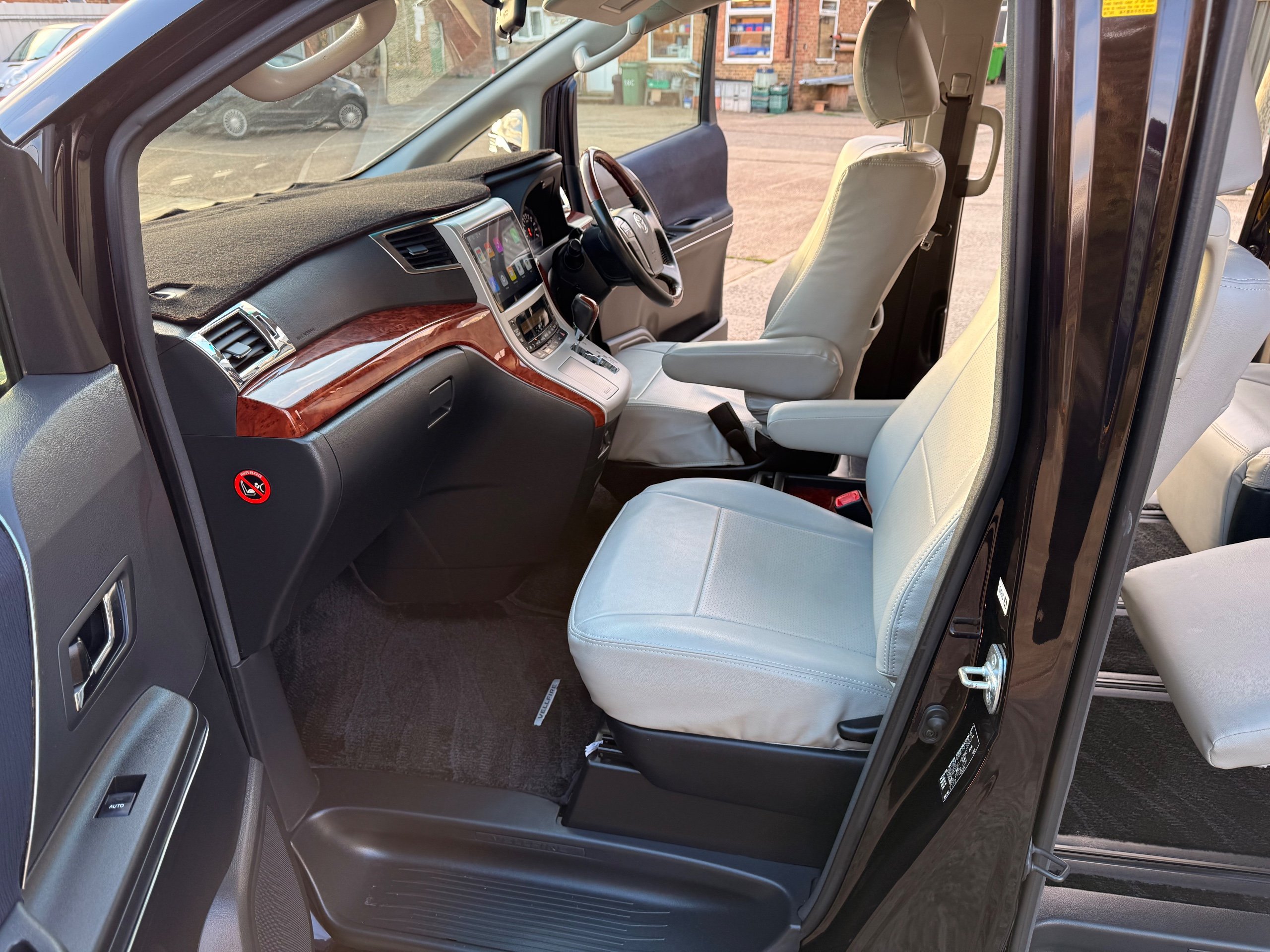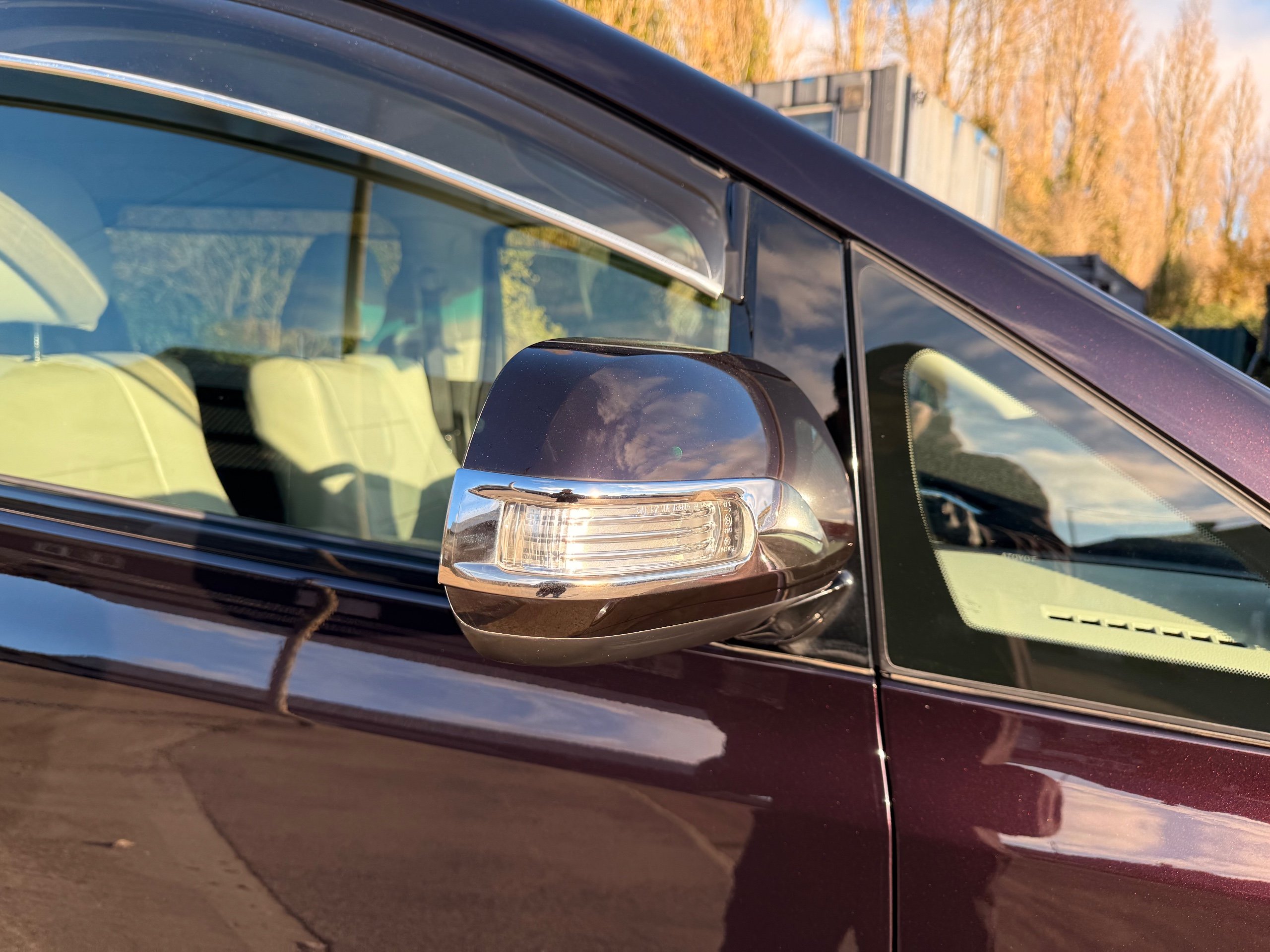 2010 Toyota Vellfire 2.4Z platinum Selection, 2010-10-Reg, Finished in Stunning Unmarked Metallic Purple paintwork, Twin Electric Soft Closing Sliding Doors, Electric Tailgate, Front spots with chrome covers, Full Privacy Glass, Rear Spoiler with built in brake light, L.E.D Lights, Chrome door handles, fold in wing mirrors with built in clear indicators with chrome covers, 20” multi spoke alloys with black gloss centres, rear chrome boot strip, Key-less Entry, Key-less start, 7 Seater 7 Unblemished Grey Leather look Expensive Seat Covers, The centre seats are Lounge style seats with extra leg rests, The seats also slide forwards and backwards and side to side with a folding centre table with built in cup holders, easy access to the rear seats, The rear seats fold away to give way to a large boot, Strip L.E.D lighting, blue foot well lights,Push button Start Front and Rear parking sensors, Traction Control, Front and Rear Electric windows, Colour reversing camera, Stereo with Apple CarPlay and Android Auto, Electric Tailgate, Isofix points, Full Dash Wood Kit, Chrome Air vent covers Only covered a Genuine 63,000 Miles With All the Genuine paperwork from Japan including the auction sheet and the Export Certificate which both prove the mileage and condition before it left Japan, Car VX Checked